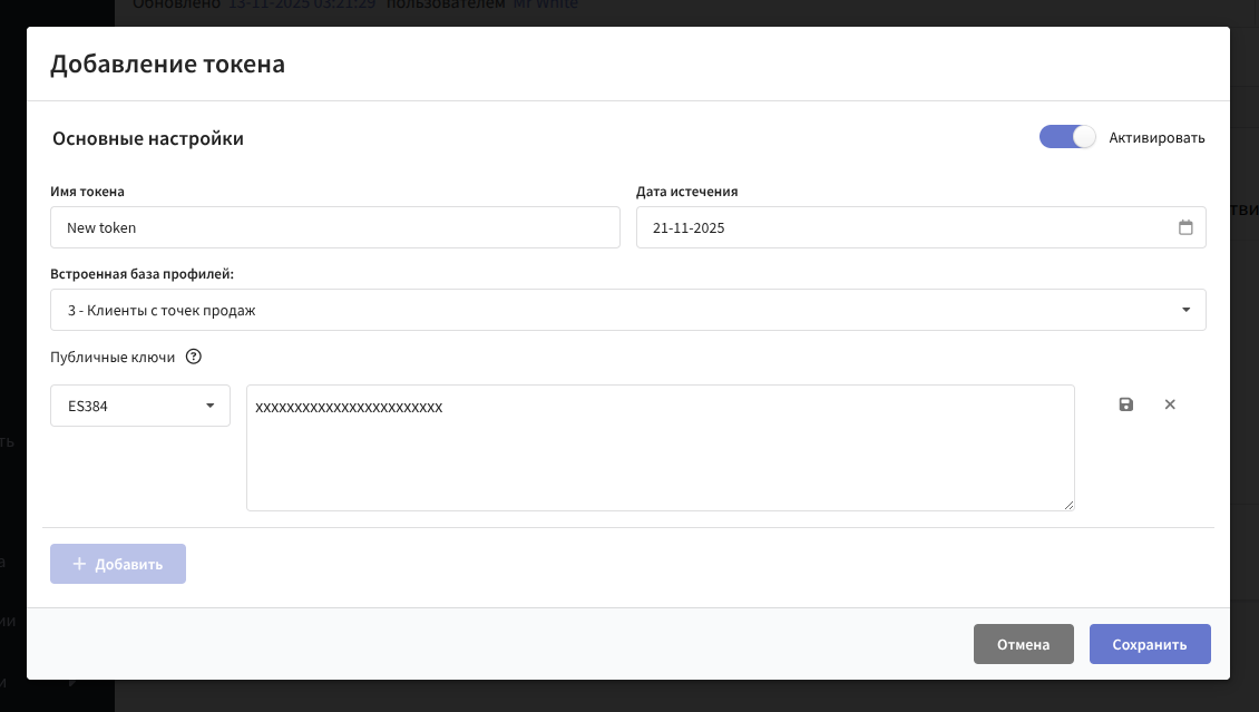 Для создания ролевого токена не требуется добавлять публичный ключ, просто укажите его название, дату истечения и привязанную к нему базу профилей: