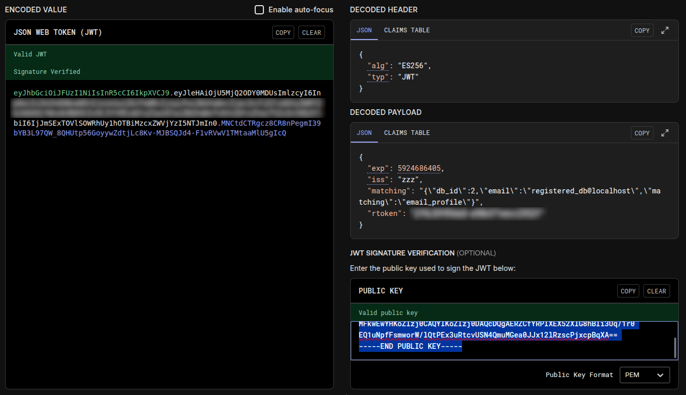 iss—issuer— уникальный идентификатор создателя токенаexp—expiration time— время истечения токена в формате UNIX timestamp в секундахrtoken— ролевой токен, полученный при настройке ресурса в платформеmatching—JSONString— сериализованный в строку объект, составленный в соответствии с документацией. Например:{"db_id":2,"email":"registered_db@localhost","matching":"email_profile"}.