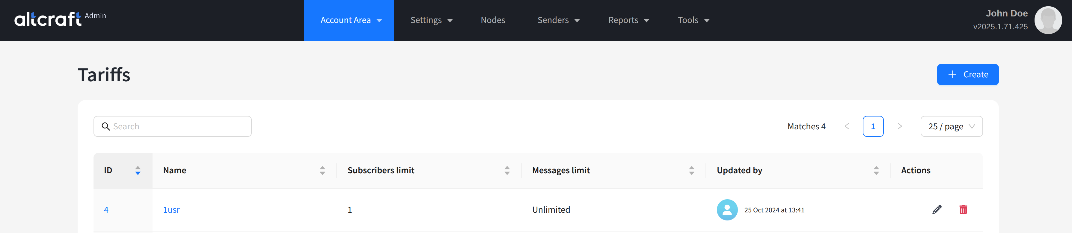 The list will display existing tariffs. On the right side of the table are the edit and delete buttons. You can also click the tariff identifier on the left to edit. To create a new tariff, click + Create: