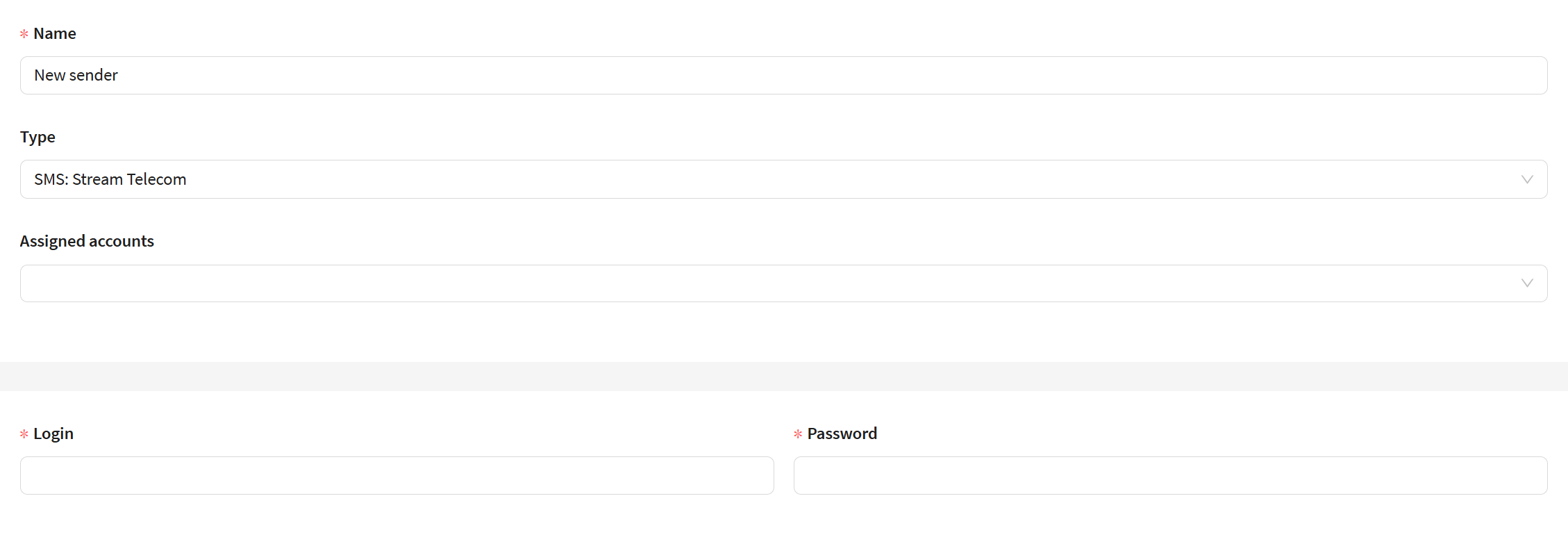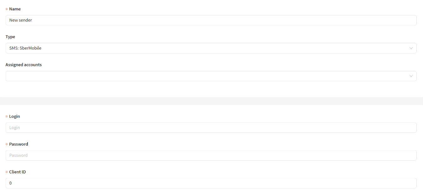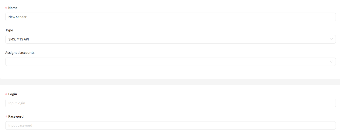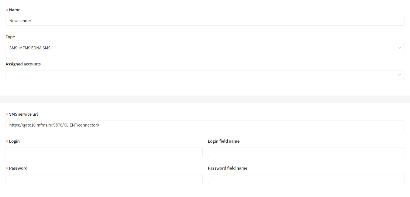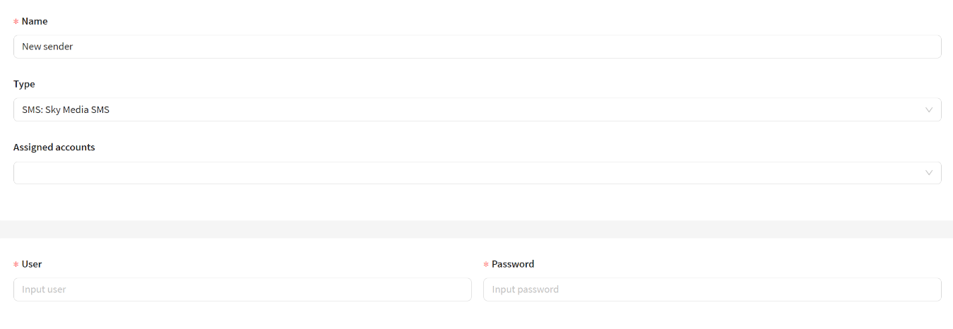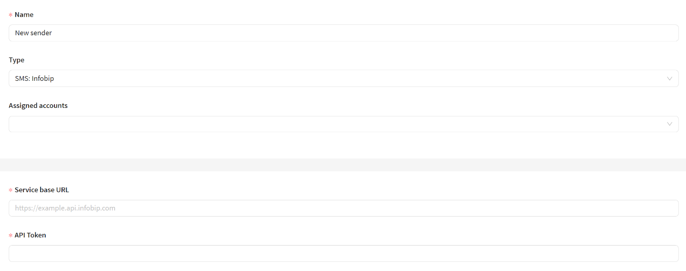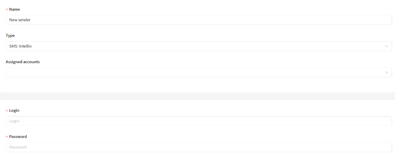 For a new sender, in the Name field specify a unique name, and in the Assigned accounts menu select platform accounts that will be able to use the sender for delivering messages: