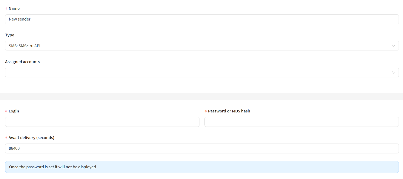 - Password or MD5 hash — password or its MD5 hash for authorization in the SMS gateway.