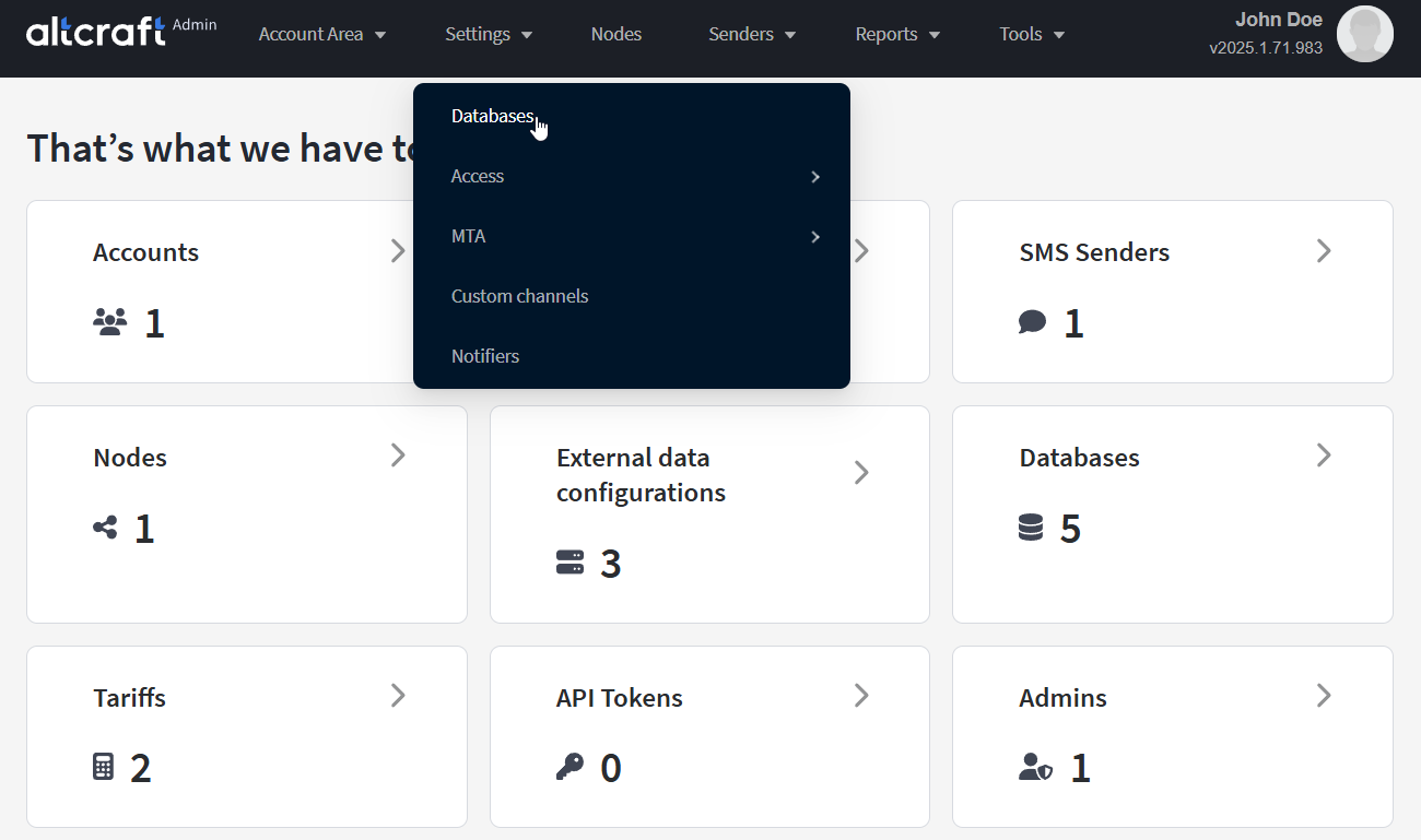 Databases is a section in the Altcraft platform designed for managing connections. In this section, you configure connectors to various databases used for storing data about orders, products, user statistics, and reports.