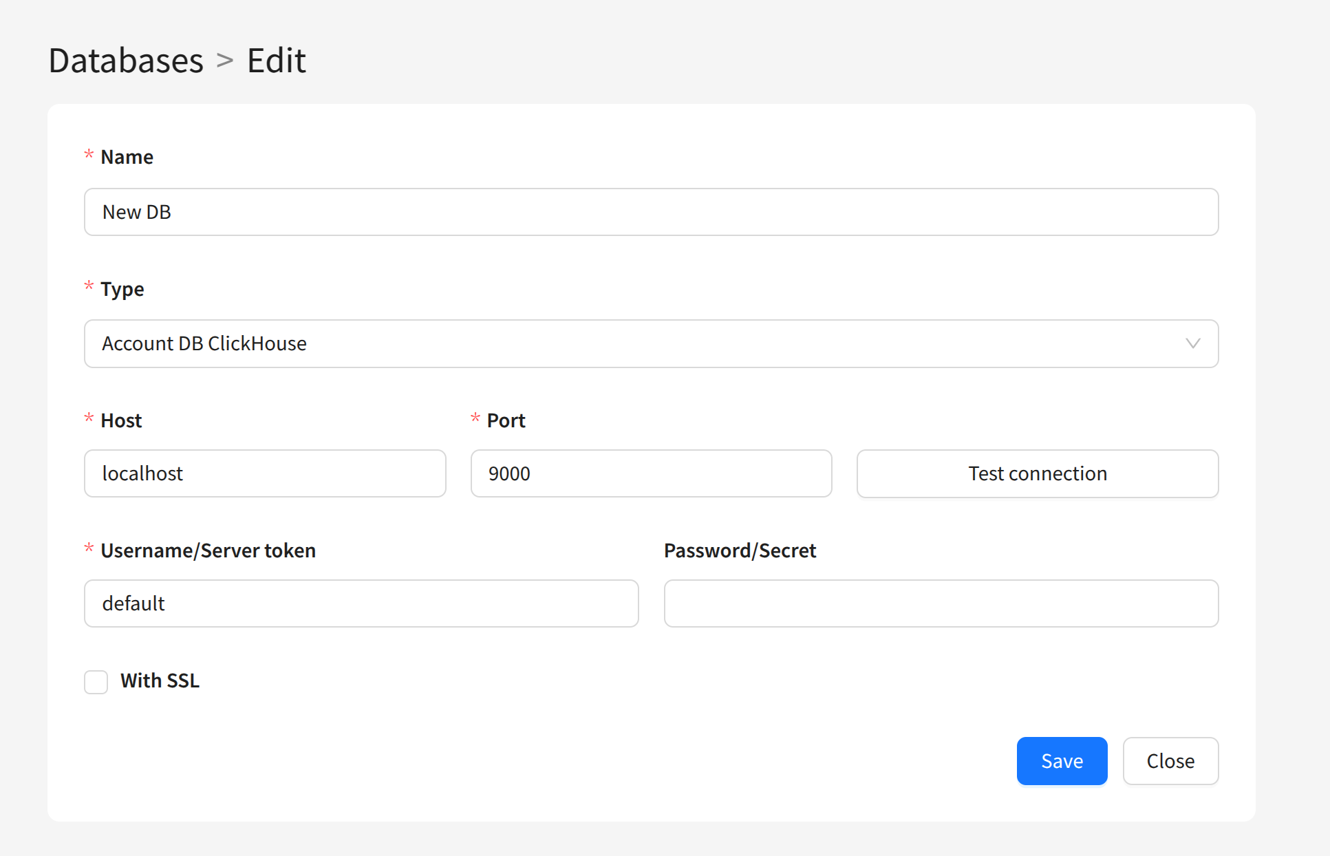 • Username/Server token and Password/Secret — authentication data for connecting to the database. A password is not used for local database deployments.