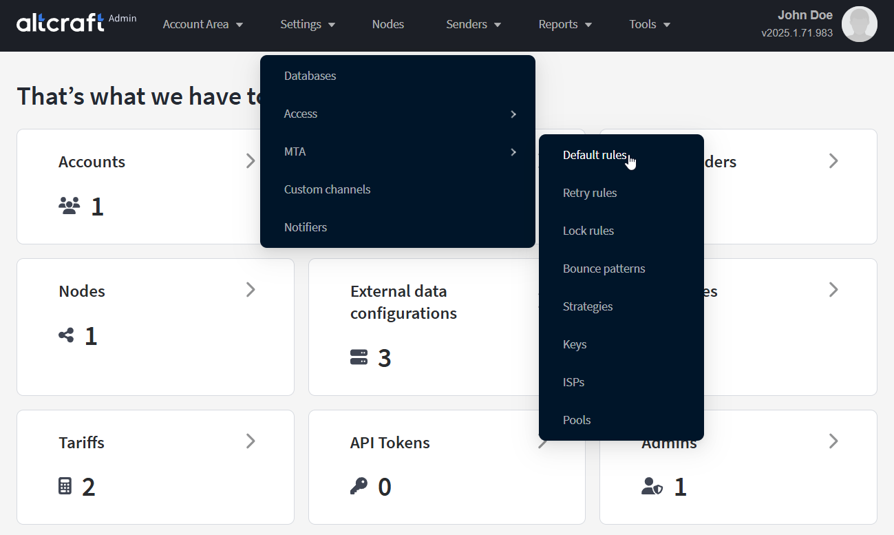 To manage sending scenarios, in the main menu select Settings — MTA — Default rules.