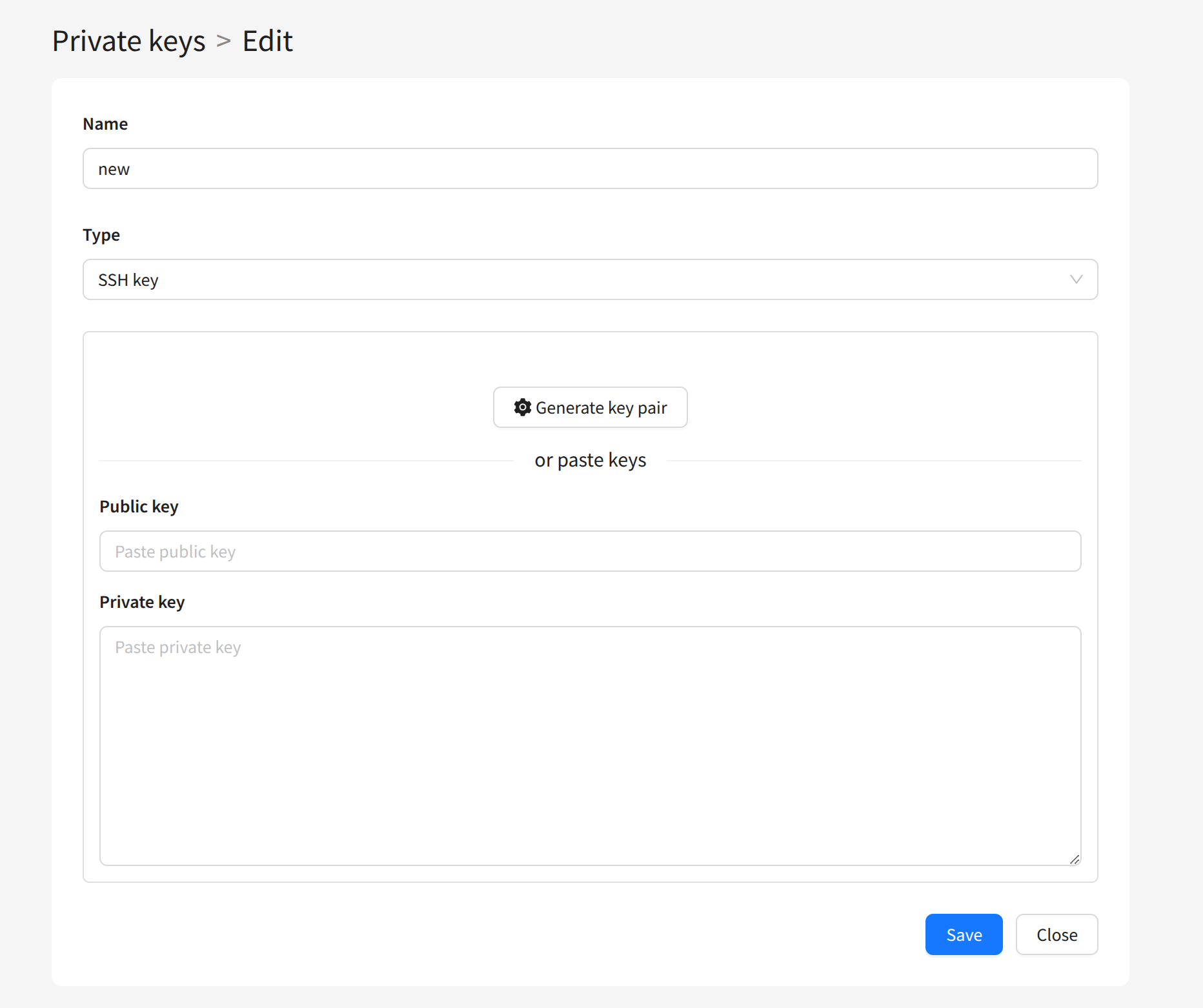 Select the key type (DKIM or SSH). After that, you can paste existing keys into the Public key and Private key fields or generate a new pair by clicking Generate key pair: