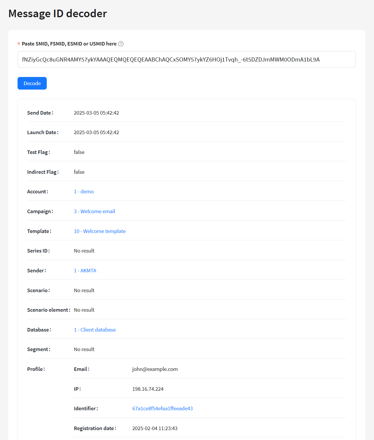 Paste the message identifier (SMID, FSMID, ESMID, or USMID) into the corresponding field and click Decode. Depending on the identifier type, the result may include information such as: