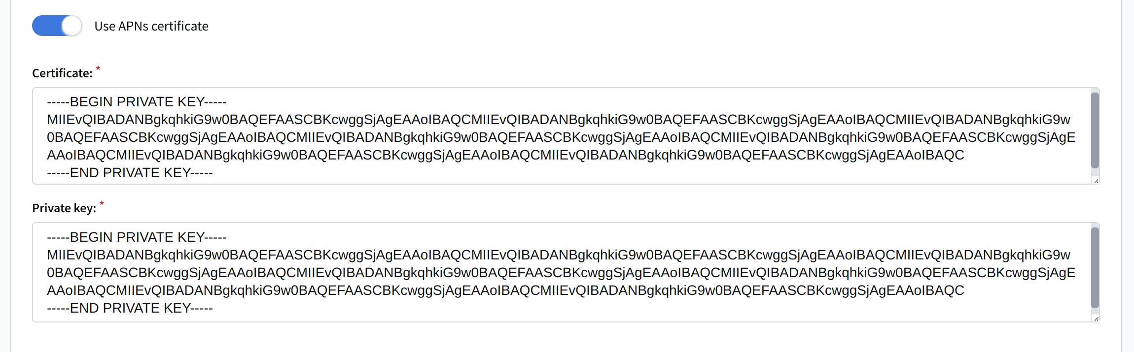 You can configure APNS using either an authorization key or a certificate. The setup method depends on the selected option.