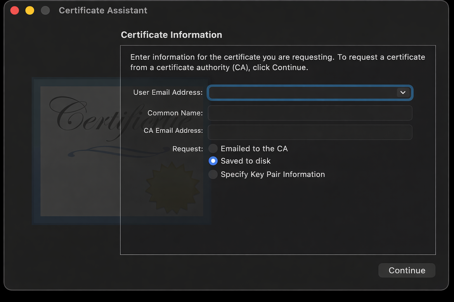 The saved .certSigningRequest file will be needed at the next step.