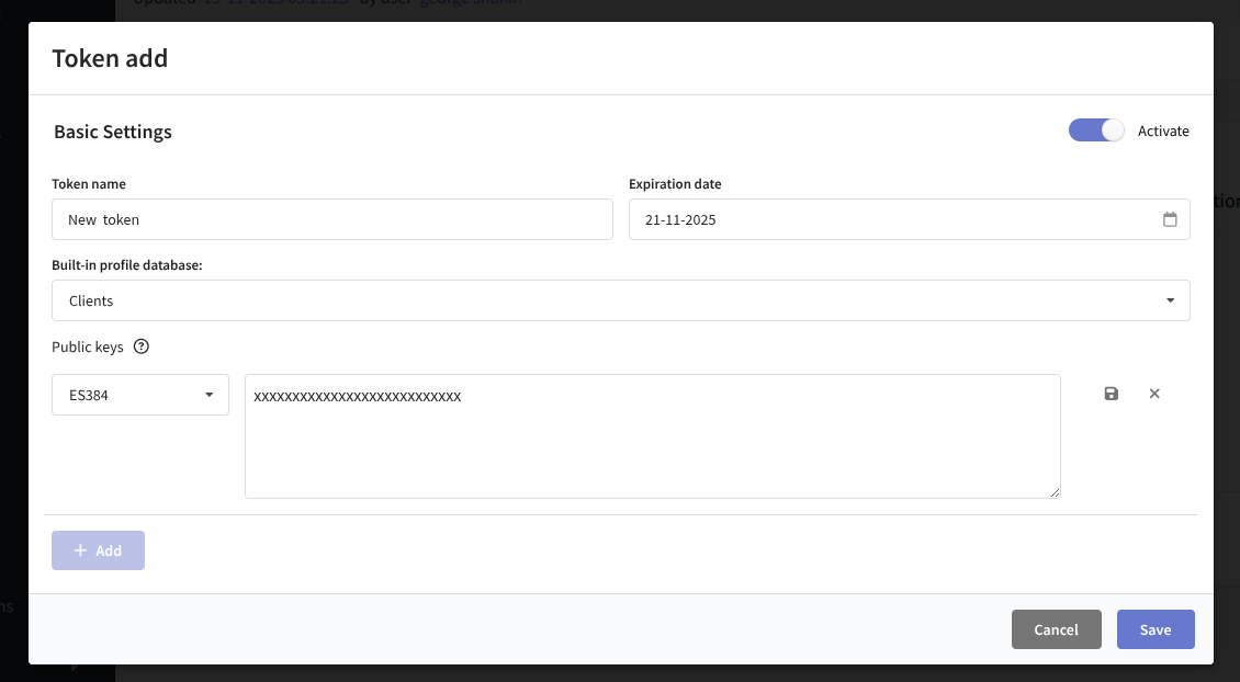 To create a JWT token, a public key is required. The platform supports the ES384 algorithm (ECDSA as the most reliable option), but RS256, ES256, and ES512 can also be used for compatibility with different application libraries.
