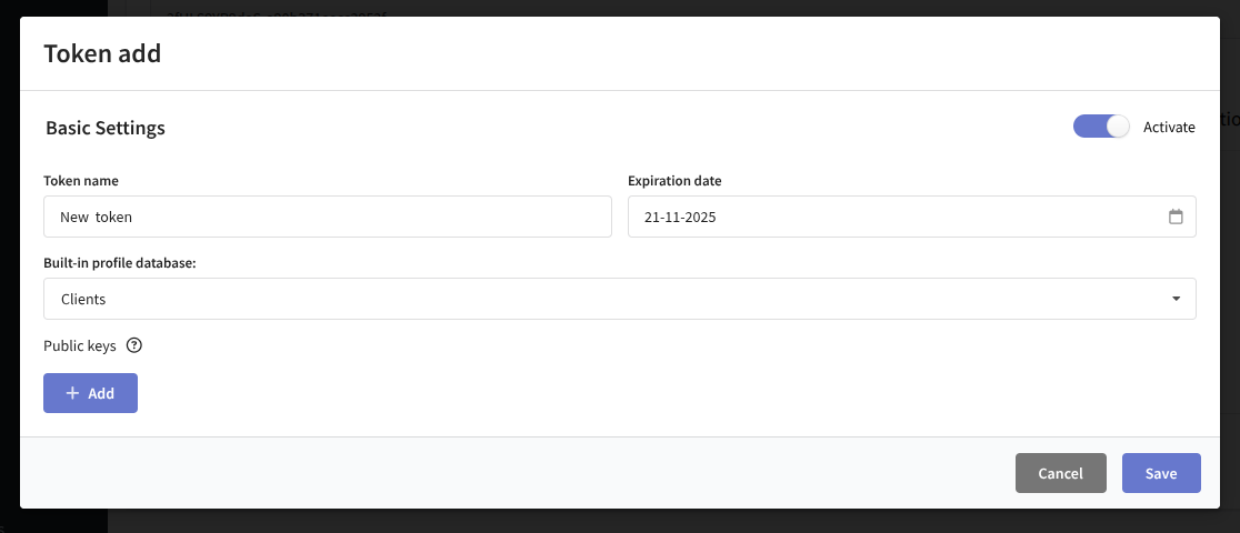 To create a role token, you do not need to provide a public key. Simply specify its name, expiration date, and the associated profile database: