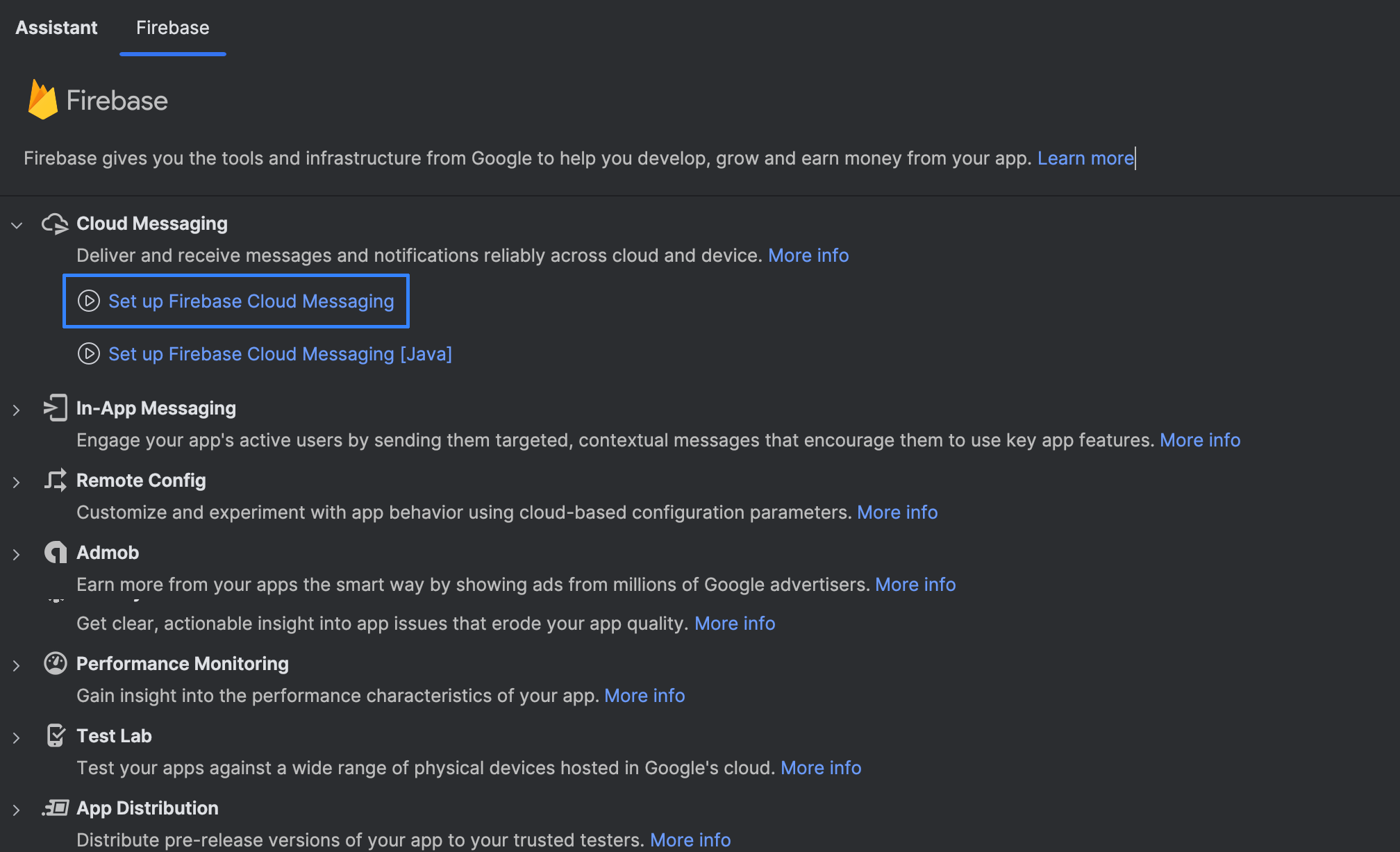 Перейдите в Tools -> Firebase -> CloudMessaging -> Set up Firebase Cloud Messaging: