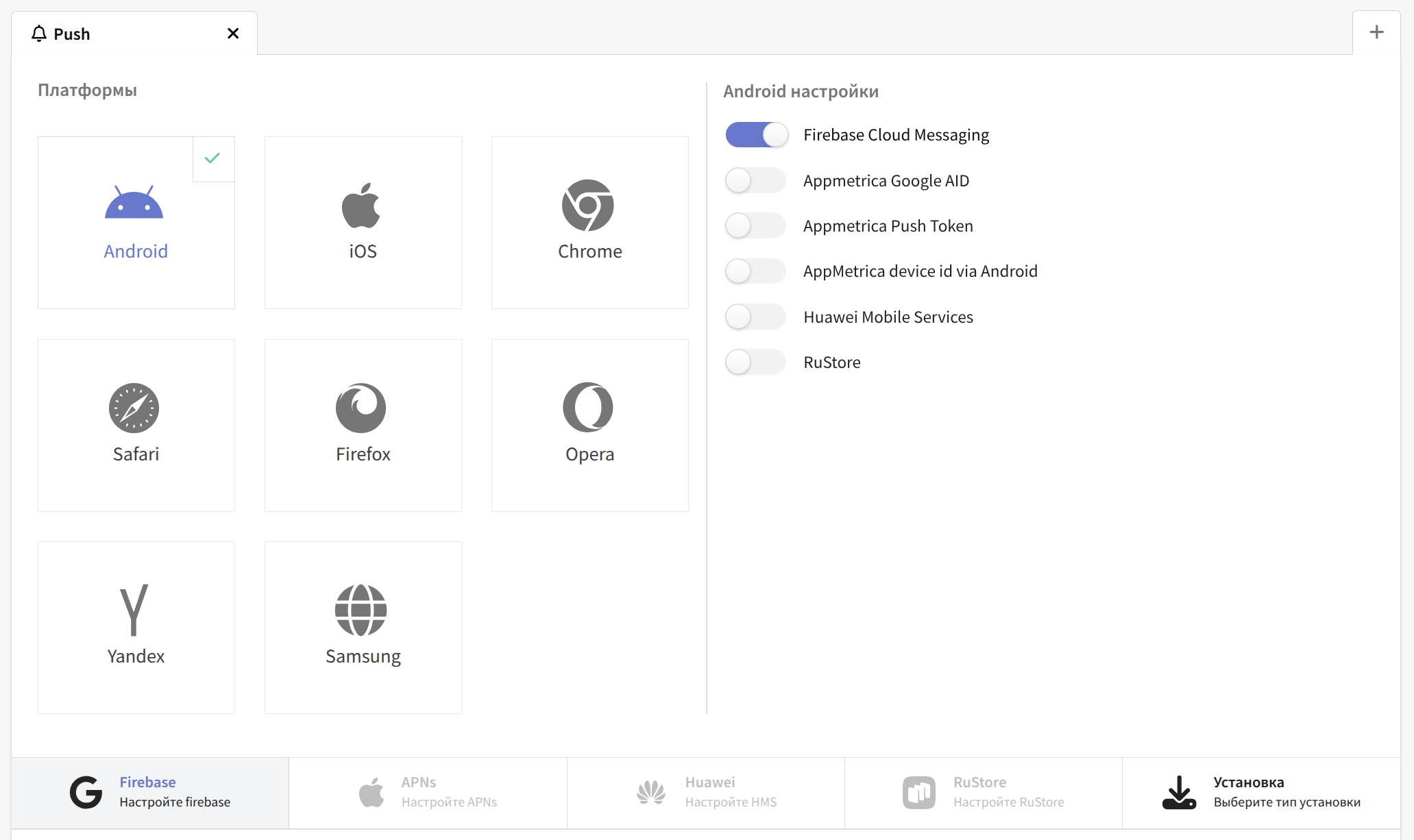 В платформе Altcraft создайте ресурс или добавьте к существующему новый канал коммуникации — Push. Затем в настройках ресурса выберите платформу Android и активируйте переключатель Firebase Cloud Messaging:
