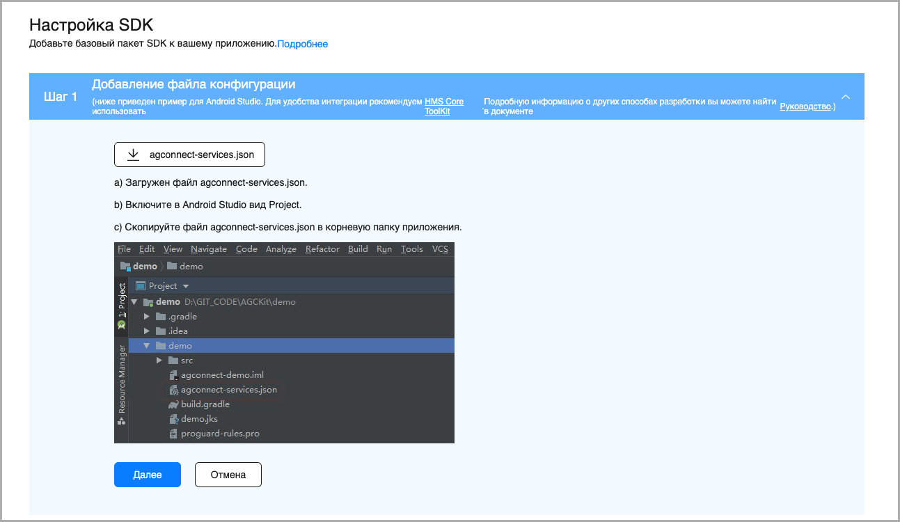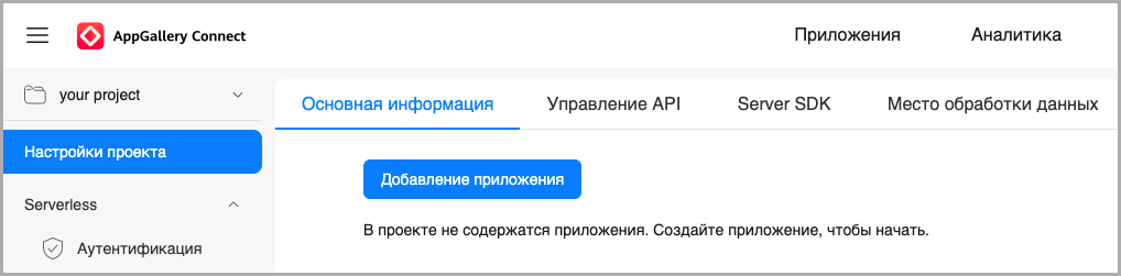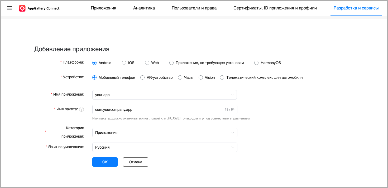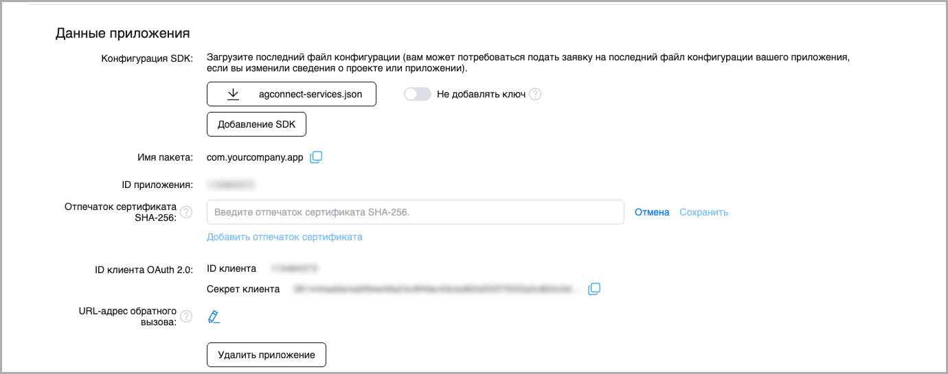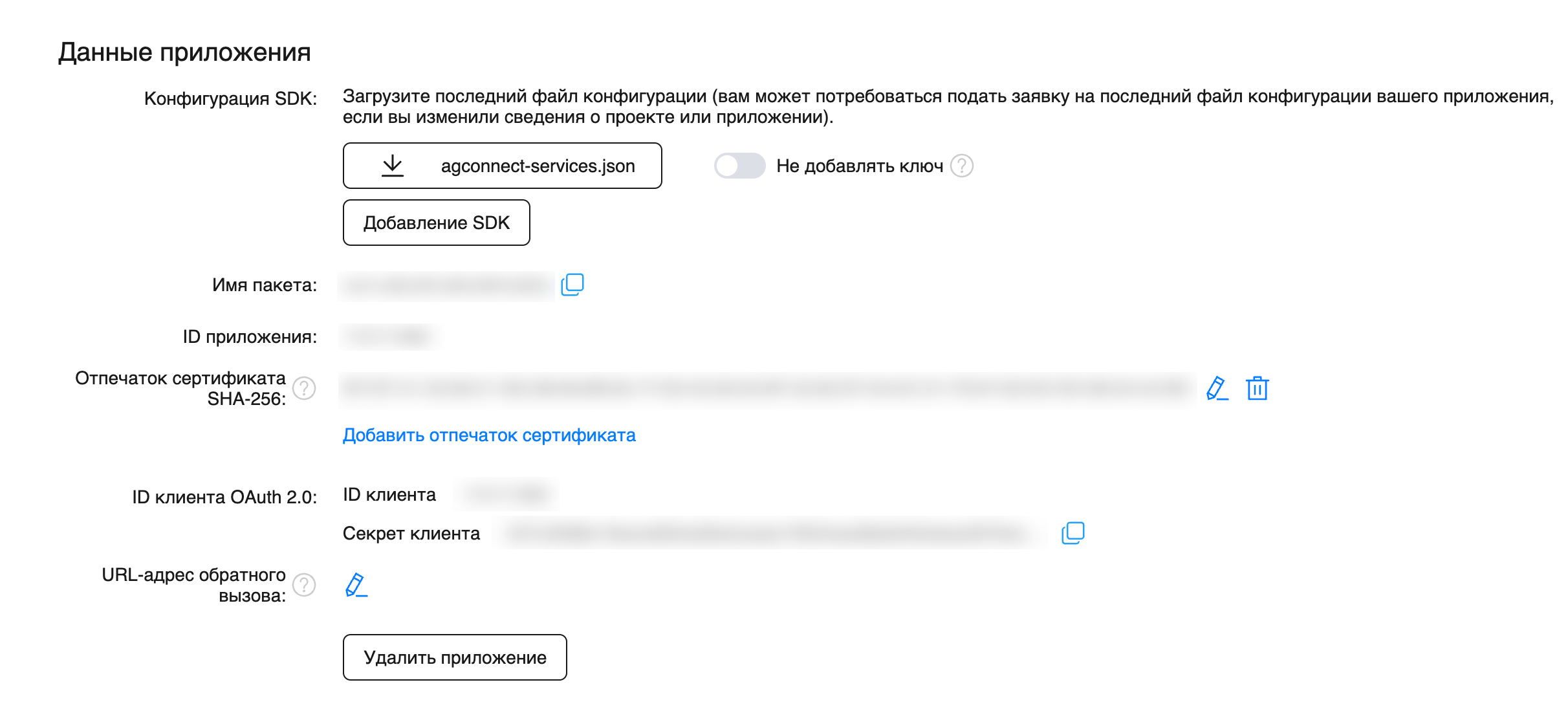 Все эти данные можно найти в разделе Данные приложения в Huawei Mobile Services (там же, куда на прошлом этапе был добавлен Отпечаток подписи SHA-256):