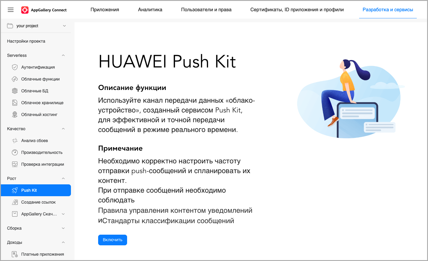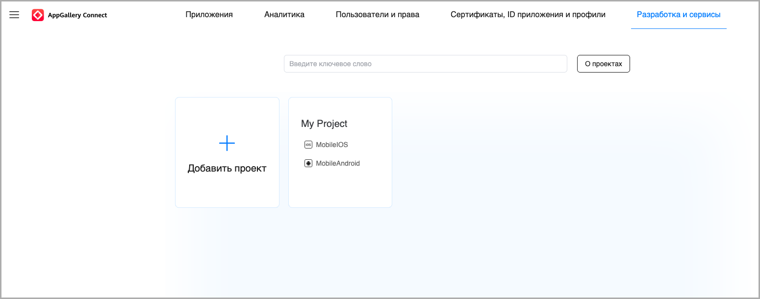 Создайте проект AppGalleryConnect. Для этого перейдите в раздел Разработка и сервисы -> Добавить проект: