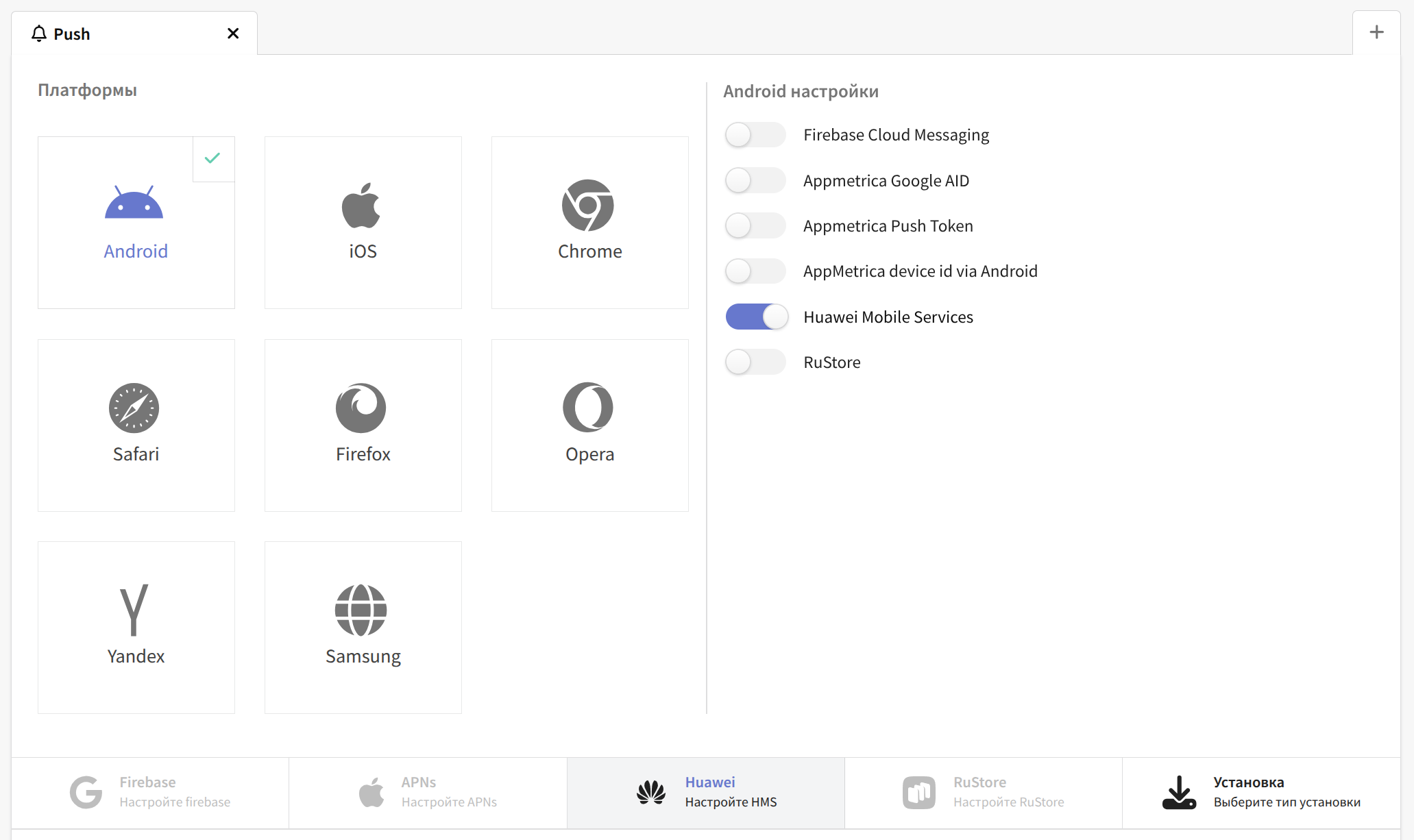В платформе Altcraft создайте ресурс или добавьте к существующему новый канал коммуникации — Push. Затем в настройках ресурса выберите платформу Android и активируйте переключатель Huawei Mobile Services: