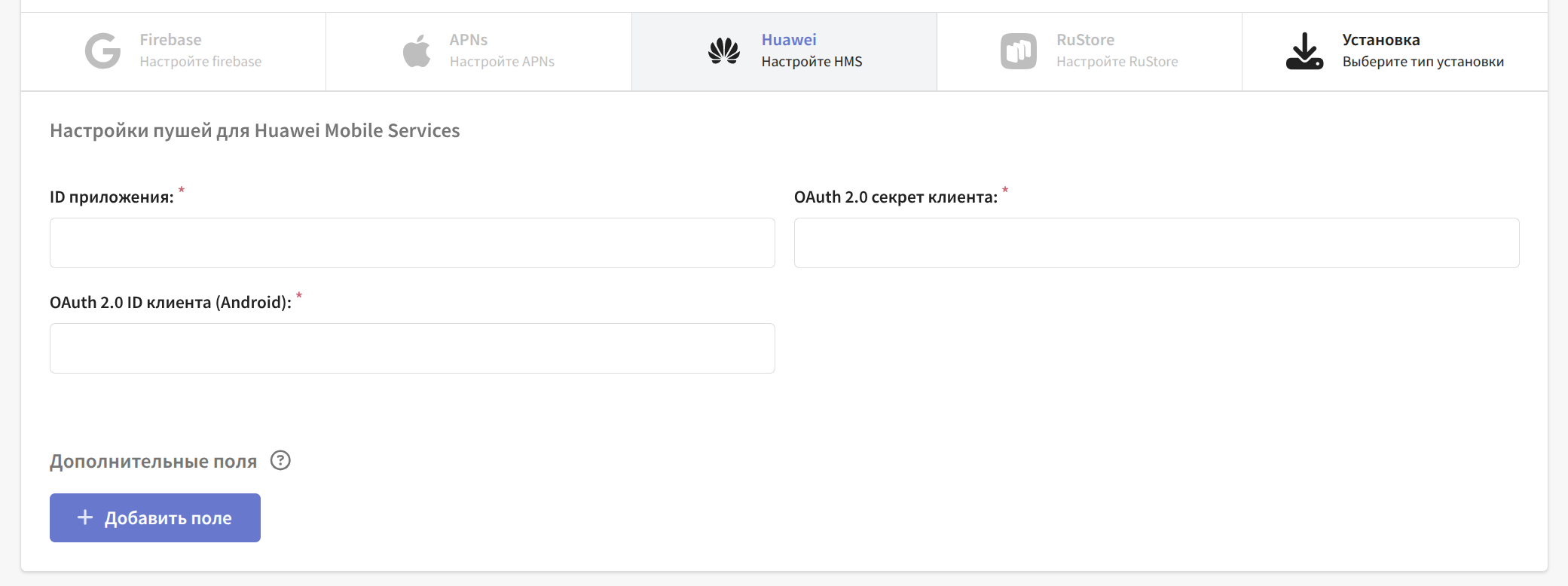 Чуть ниже перейдите в настройки Huawei и укажите ID приложения, ID клиента OAuth 2.0 и секрет клиента OAuth 2.0: