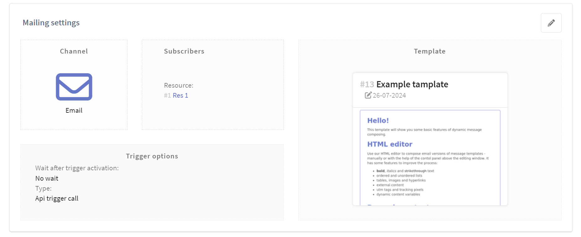 ![]() | Trigger is activated when a new subscription is added to a profile or the status of an existing subscription is changed. For the trigger, you can separately specify Resource and Channel for which changes will be tracked. Otherwise, the mailing will expect changes for all channels of the selected resource, for all resources for the selected channel, or for any subscriptions of the profile. |