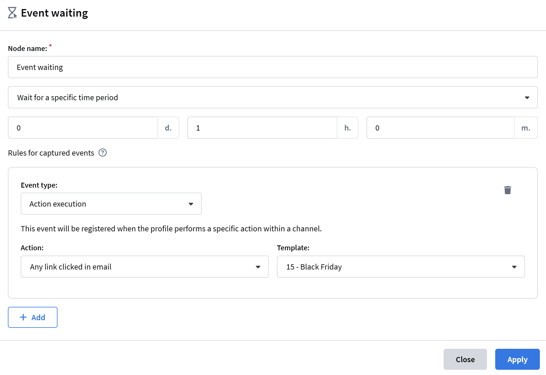 A new scenario element has been added — the "Event Waiting" operator. It stops the profile flow until a specific action is performed. As soon as any of the specified events are registered by the platform, the profile moves to the next element along the corresponding branch. If the event does not occur within the specified time, the profile follows another branch.