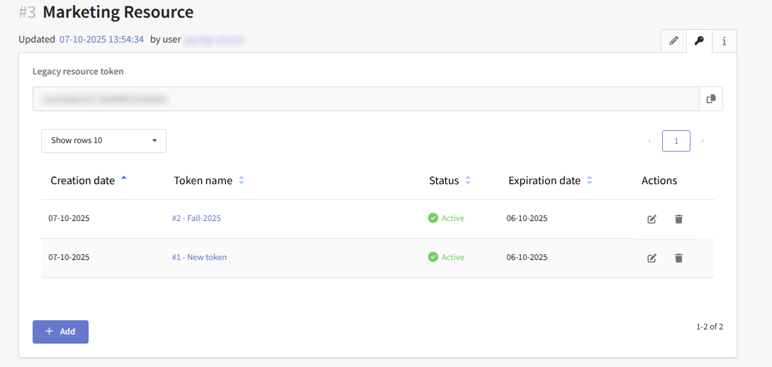 - Added a new tab for managing resource tokens. On this tab, you can create a token for a resource, set its expiration date, and assign roles. You can access this tab after creating and saving the resource (located in the upper-right corner of the screen):