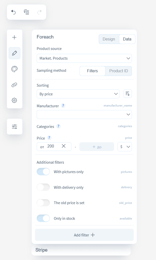 You can customize the design of product cards and apply filters directly in the editor using an intuitive interface. Data updates dynamically when sending emails, and for one-time mailings, you can lock products in the card to turn them into static content.