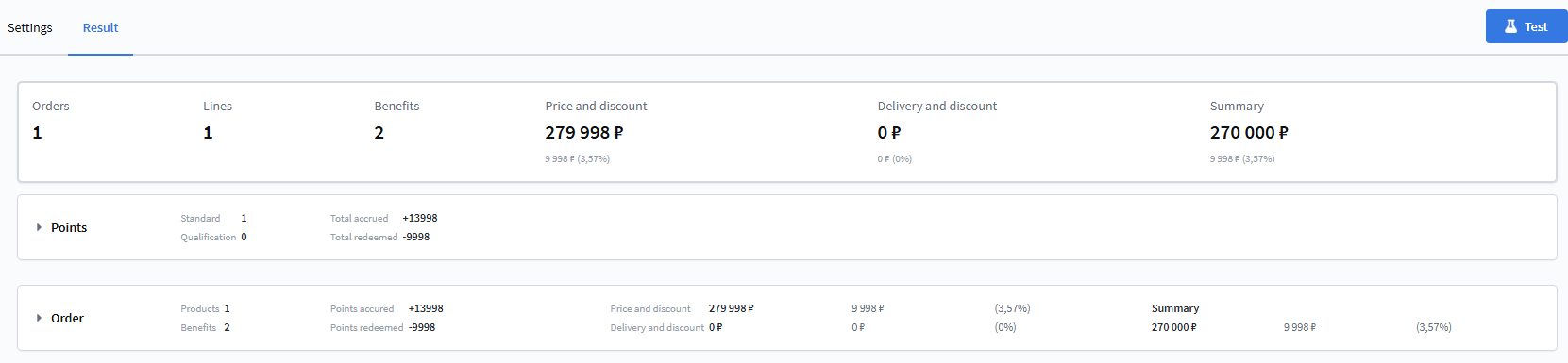 After configuring points and promotional campaigns, you can verify that everything works correctly using the promotion testing feature. You can perform a preliminary order calculation for both an existing profile in the database and a test participant with manually specified context: