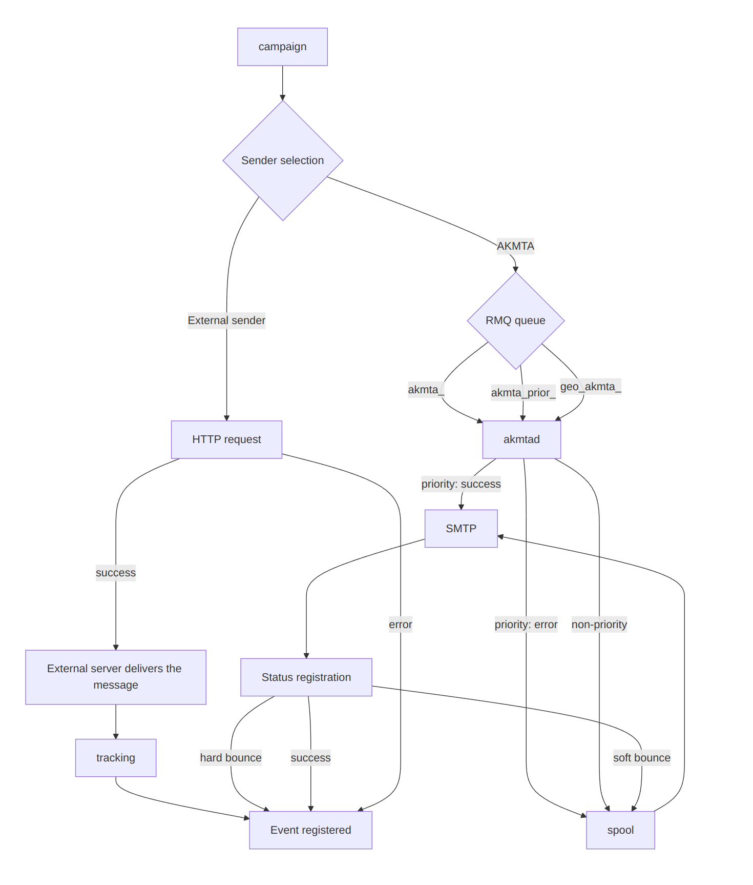 campaign → RMQ Queue (akmta / akmta_prior) → akmtad → SMTP