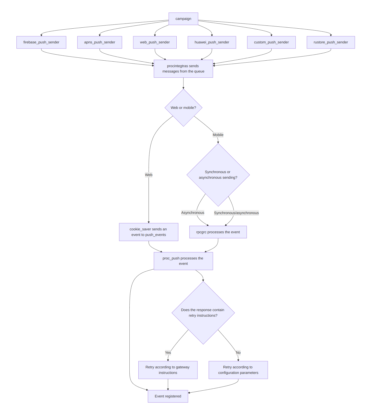 For mobile push, the logic is similar, but asynchronous sends are processed via push_events, while synchronous ones are immediately handled by procrpc.