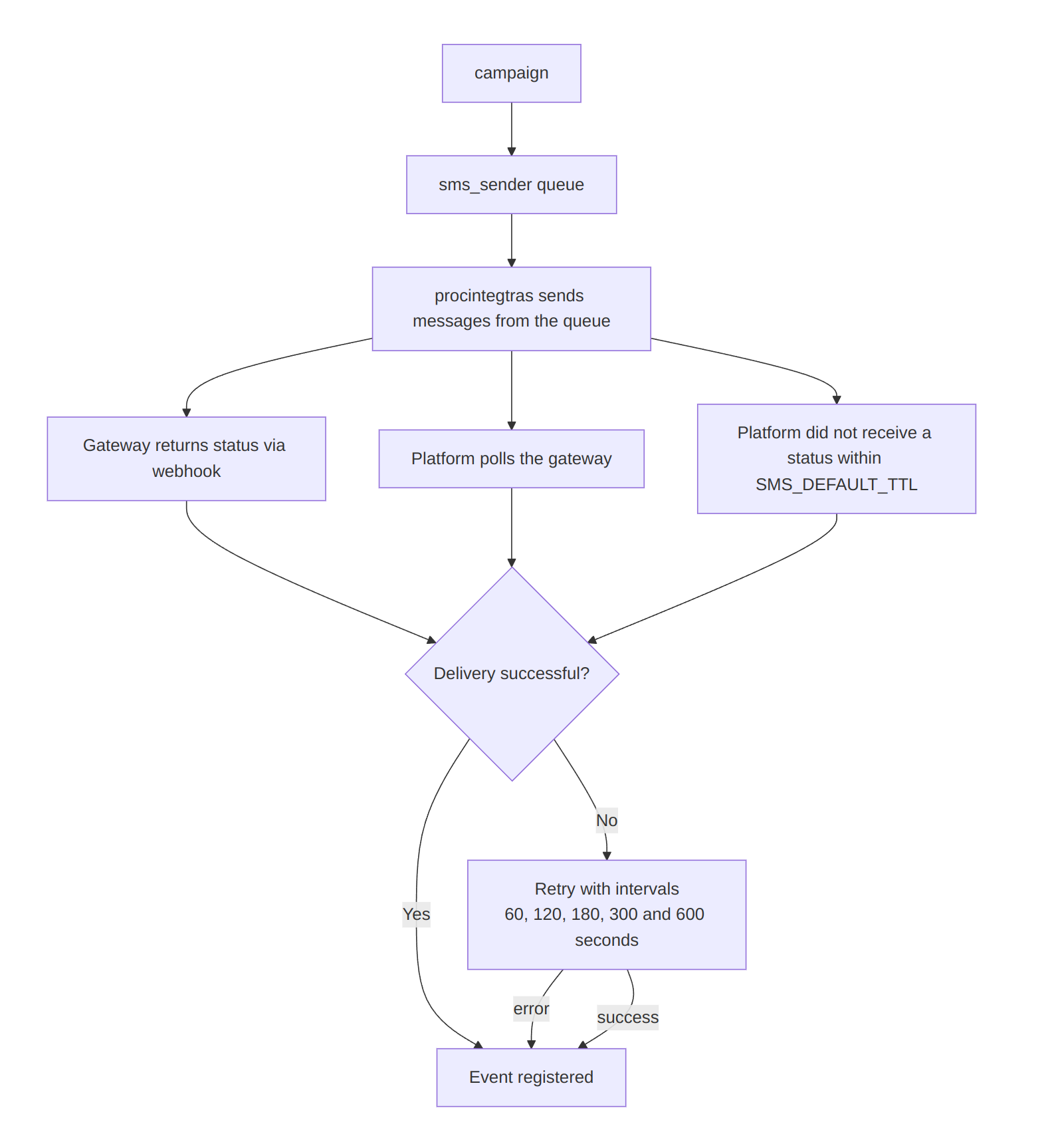 procsmslisten; - The platform polls the gateway. The status is processed by