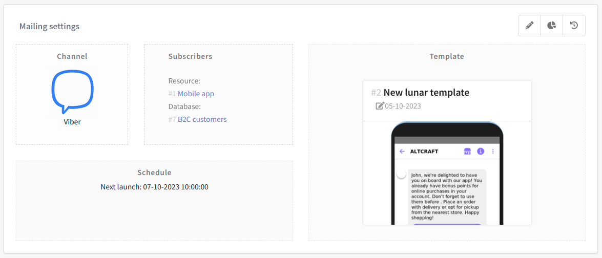 button in the quick actions panel. An active mailing will start sending messages when the scheduled launch time arrives.