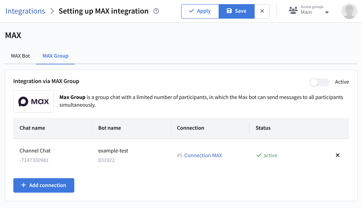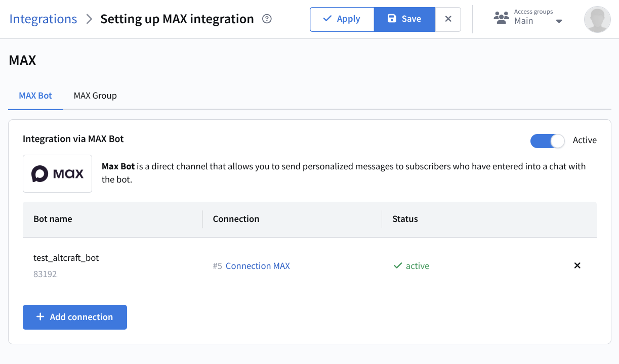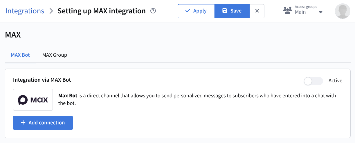 To create an integration, you must first configure a connection to the service. Instructions for connecting a MAX bot are available on this page.