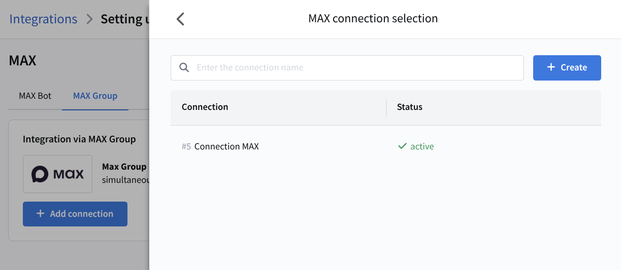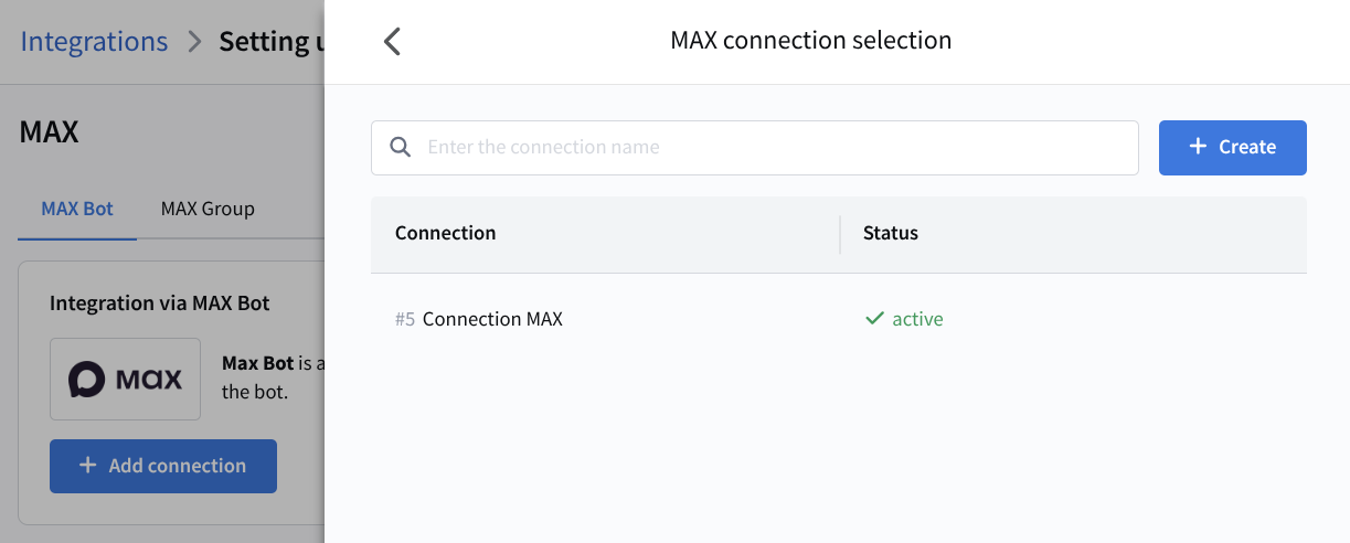A list of created MAX bot connections will appear. Select the required connection from the list or create a new one: