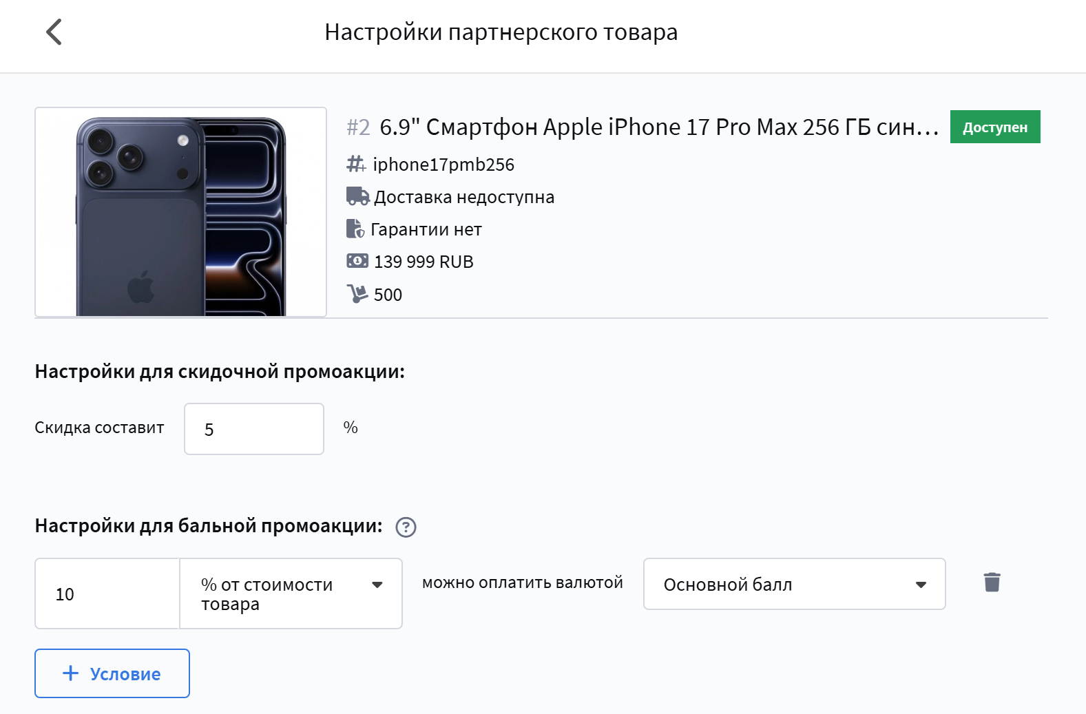 Partner products are used to form special offers within the loyalty program. Such offers are available only to participants for whom the partnership terms apply and are configured through corresponding promotions with the "Discount from a partner" benefit.