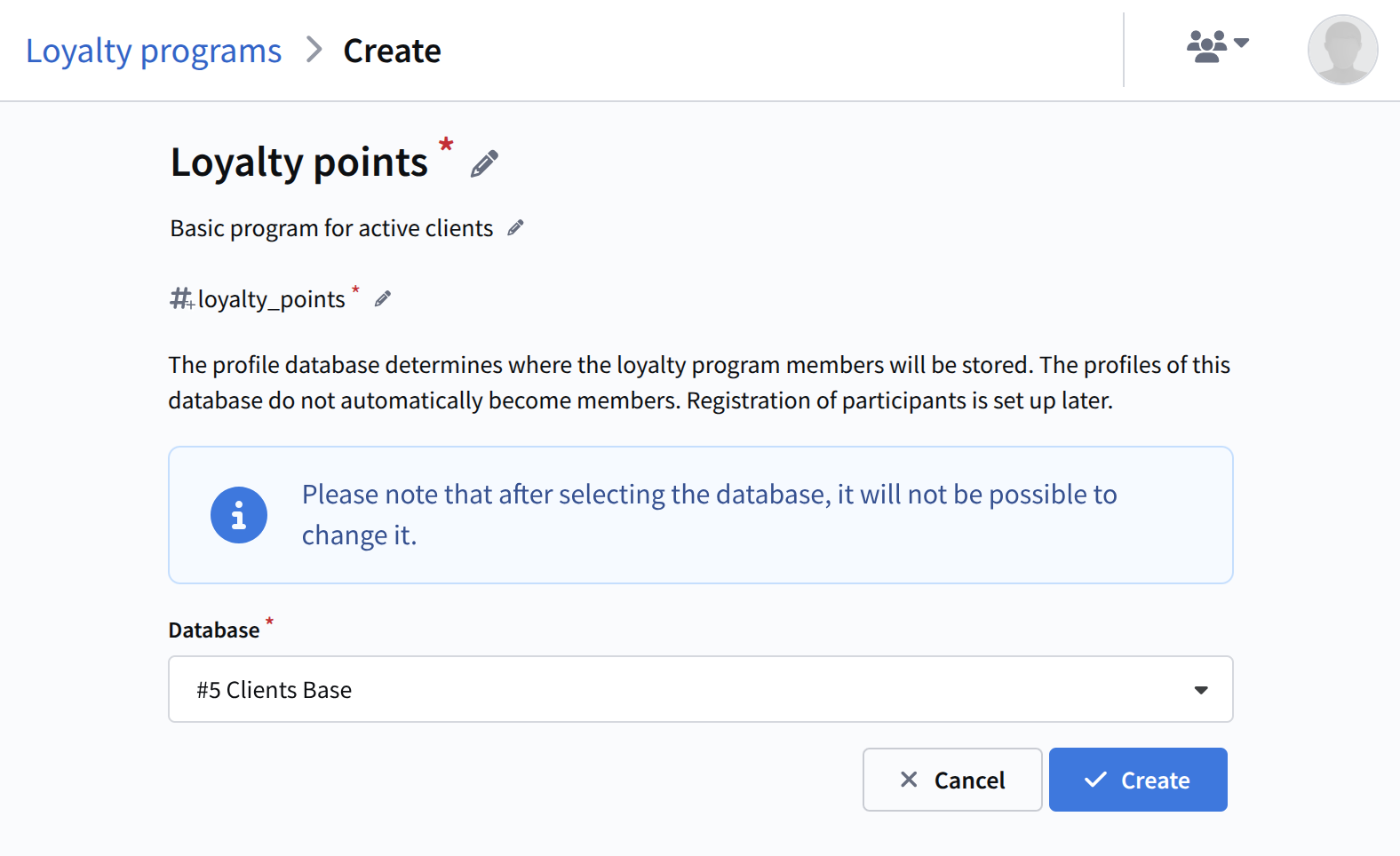 Please note: after selection, the database cannot be changed; only one loyalty program can be active in a single database at a time.