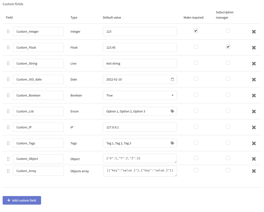 Custom fields are created by users of the Altcraft system to store specific for business customer information. You can create unlimited custom fields. They can contain 10 different data types: