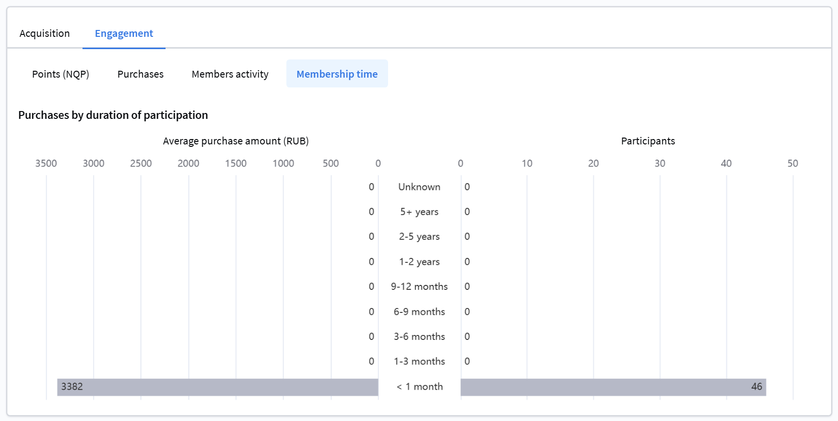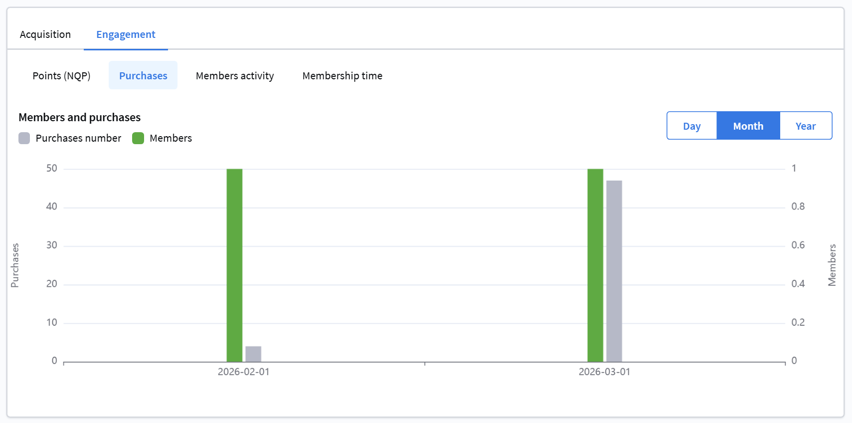 This section shows member engagement based on activity. It includes the Points, Purchases, Member activity, and Membership duration tabs.