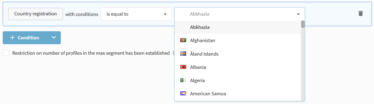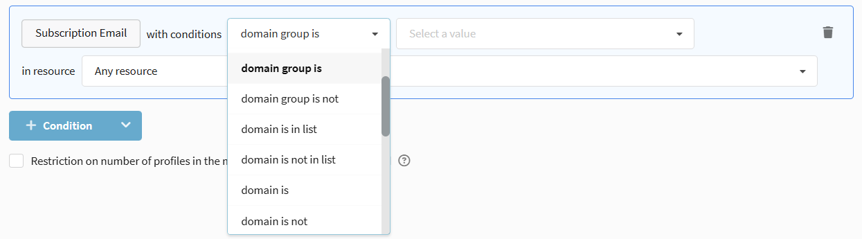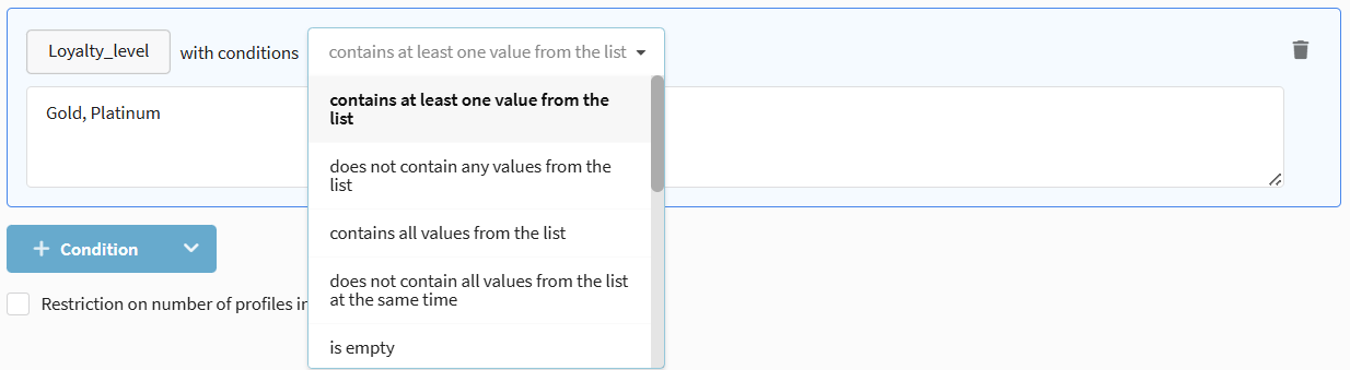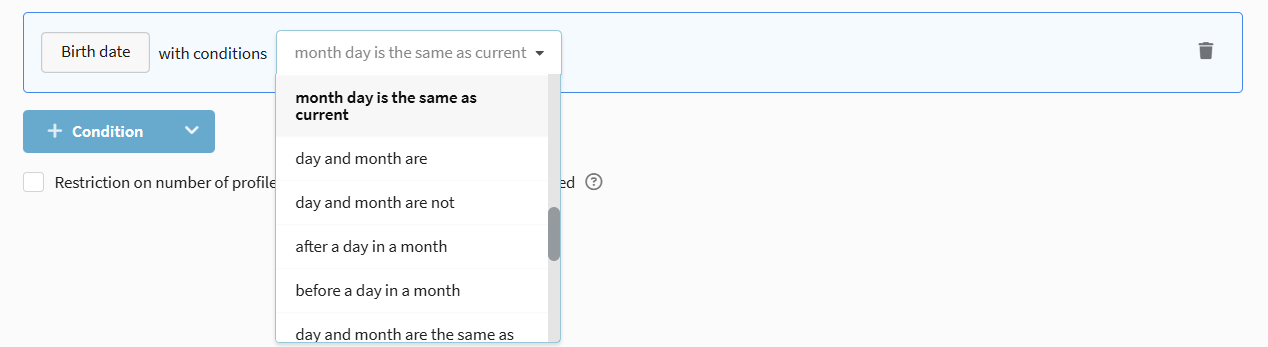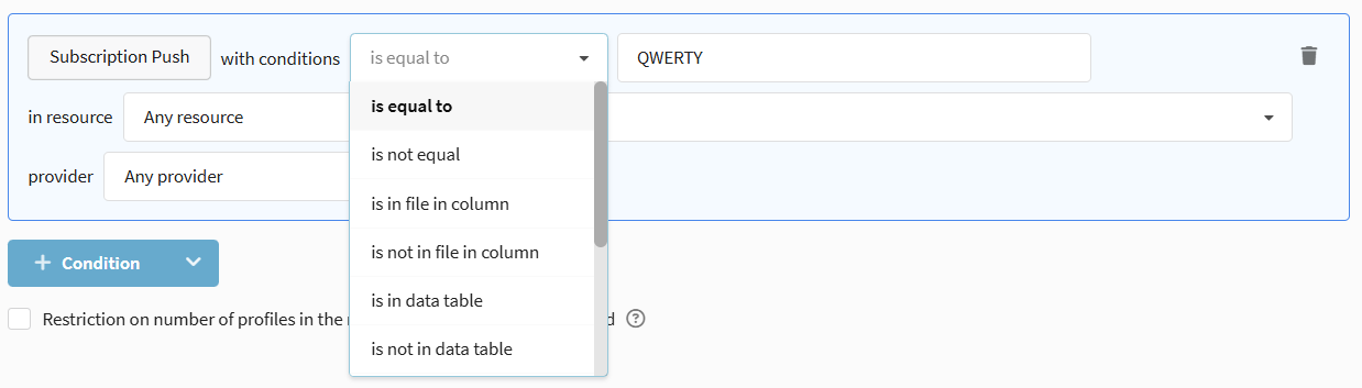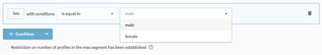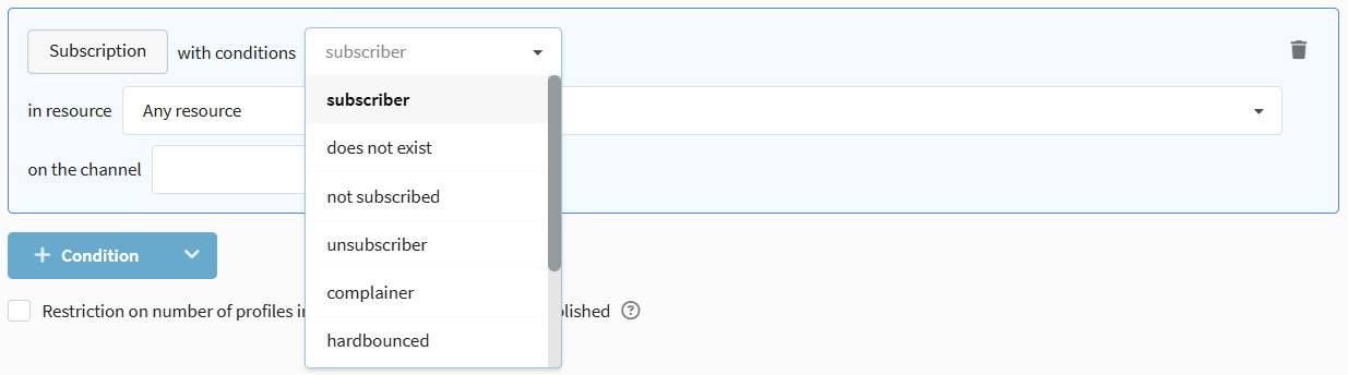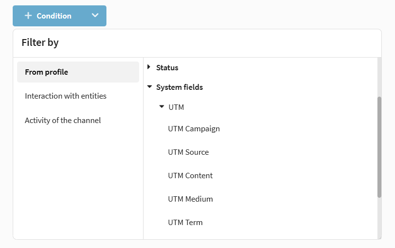 SegmentationSegmentation ConditionsFrom ProfileDocumentation for version v74On this pageFrom Profile Profile data is the main information about a subscriber that can be used for precise audience segmentation. This section combines everything: from name and email to system labels and subscription statuses. Main Fields
