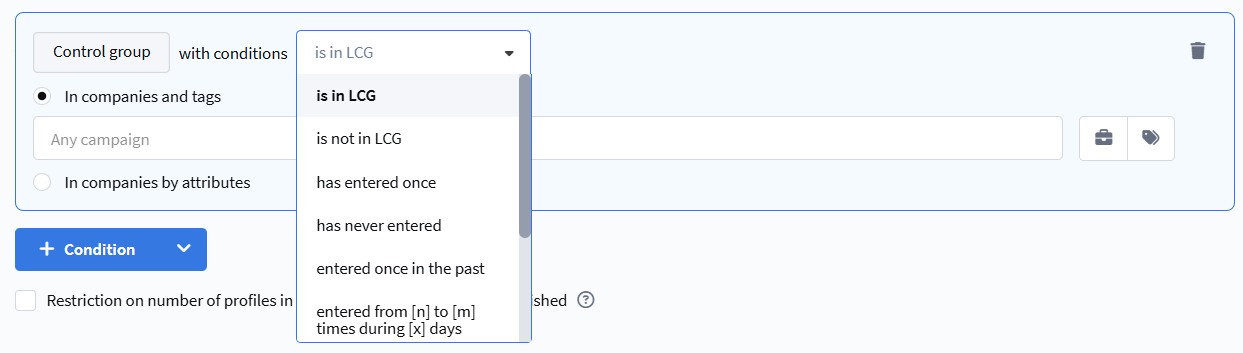 - entered at least [n] times in the last [x] days — the profile entered the campaign the specified number of times in the last X days.