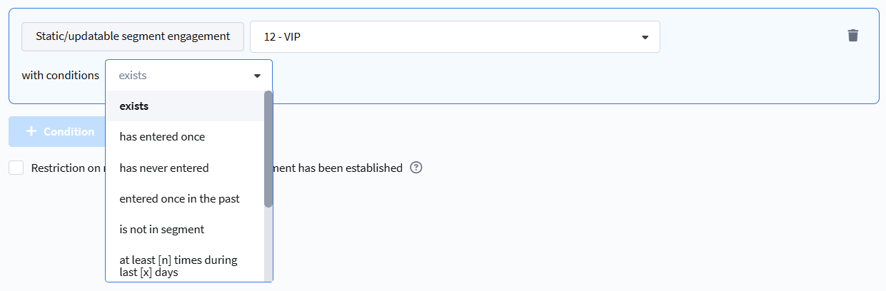 - currently not, but entered at least once — the profile is currently not in the segment but was in it previously.
