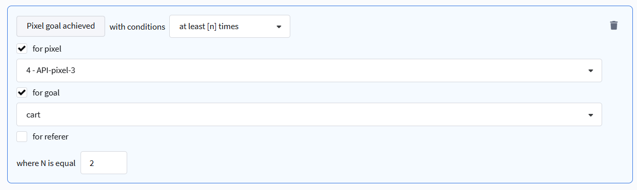 - At least [n] times / Not once — selection based on the number and frequency of actions performed. Can specify goal, pixel, or referrer (traffic source).
