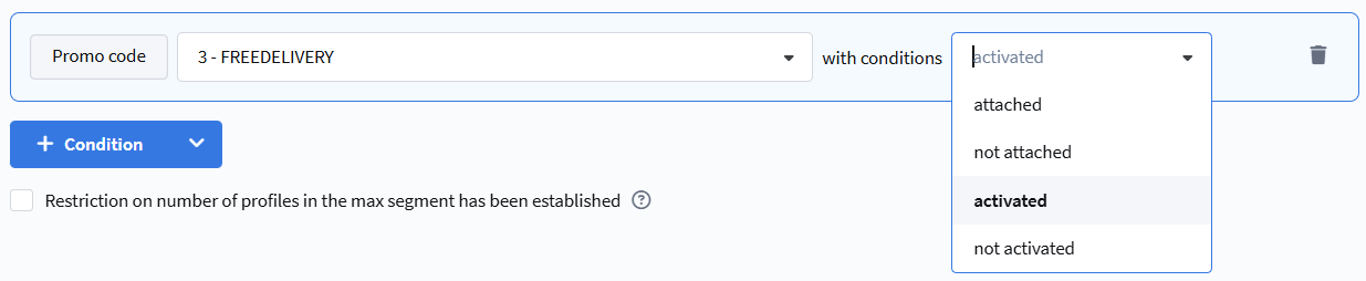 - Activated / Not activated — selection based on the fact of promo code activation (e.g., upon purchase).