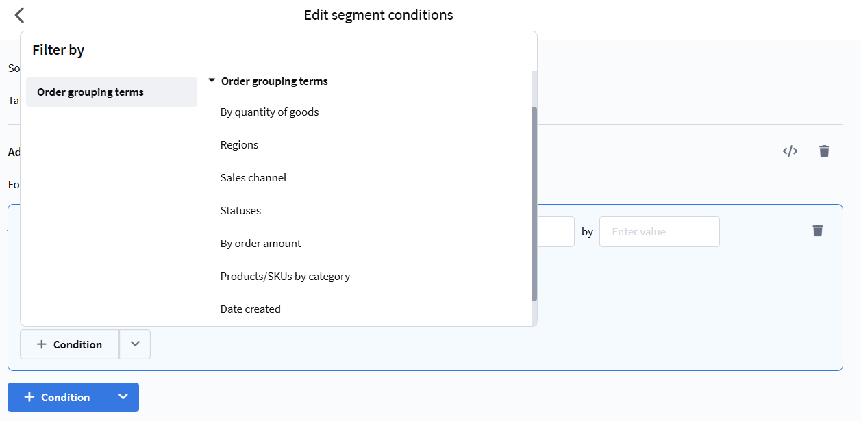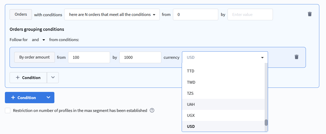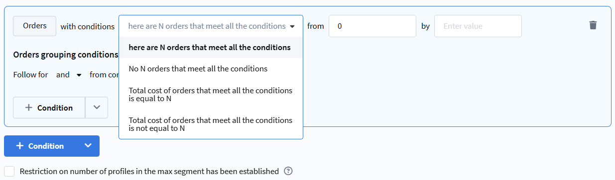 Segmentation based on orders registered in the "Market" module. Allows building selections by amount, quantity, products, and other order parameters.