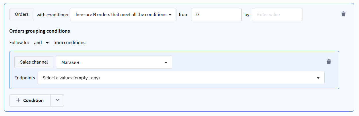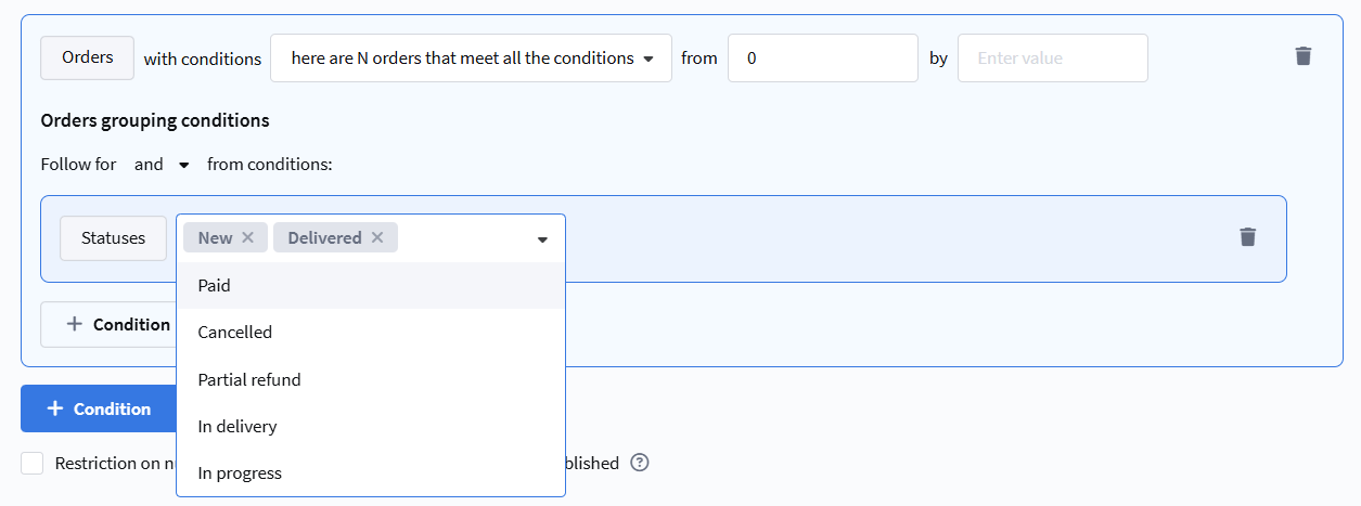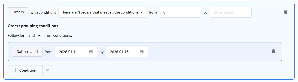 Within the rule, additional conditions can be set to select specific orders: