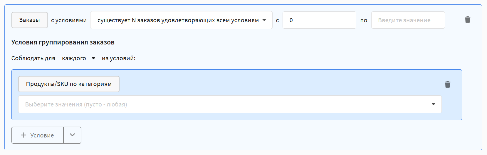 In any of the rules described above, you can set additional conditions to specify which orders to take into account. The following parameters are available: