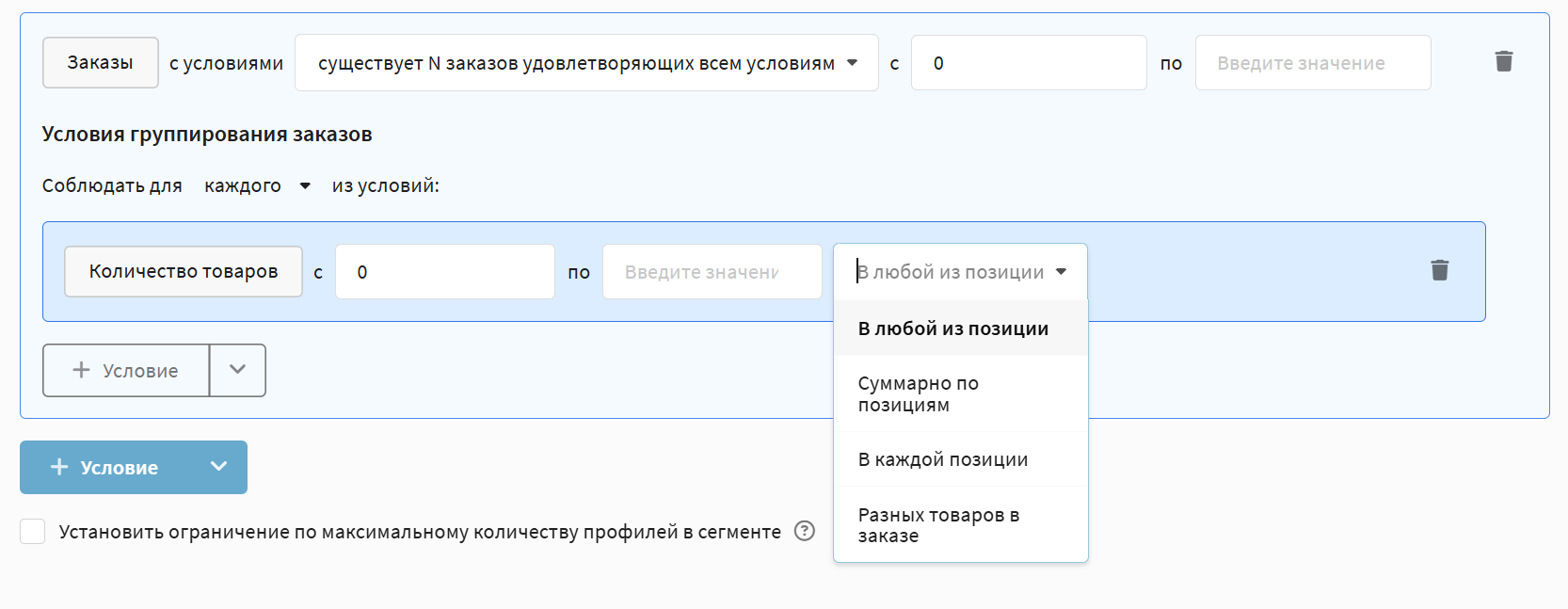 - Total cost of orders that meet all the conditions in range — selection of profiles whose total order amount falls within the specified numeric range.