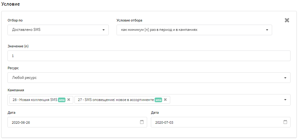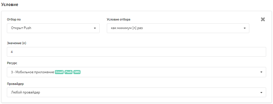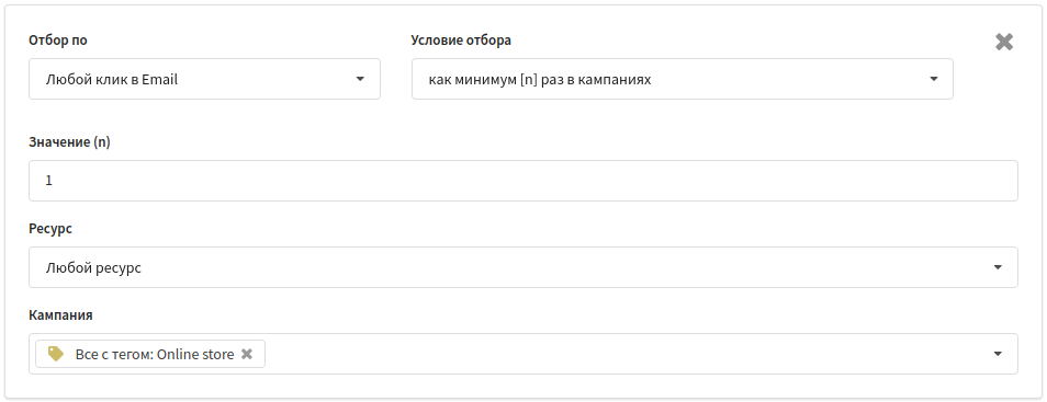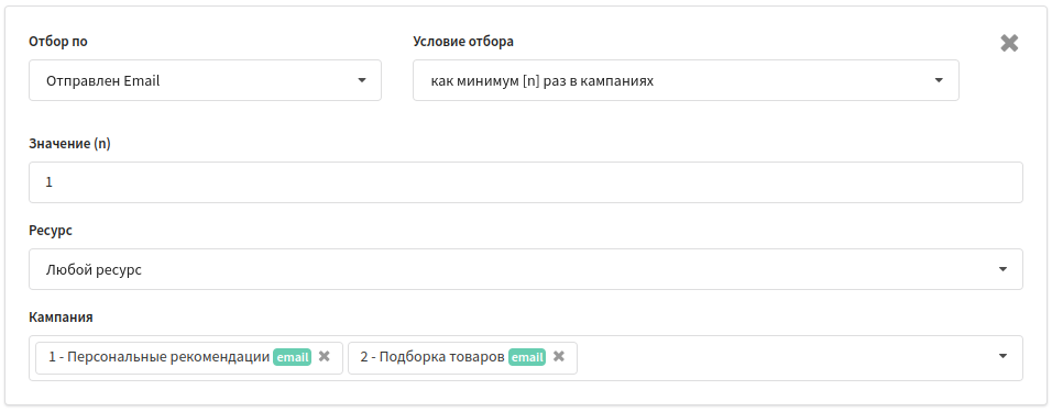 - Как минимум [n] раз — выборка по наличию указанного количества событий у подписчиков. В зависимости от оператора можно дополнительно указать Рассылку, Сообщение, период времени или количество дней с текущей даты.
