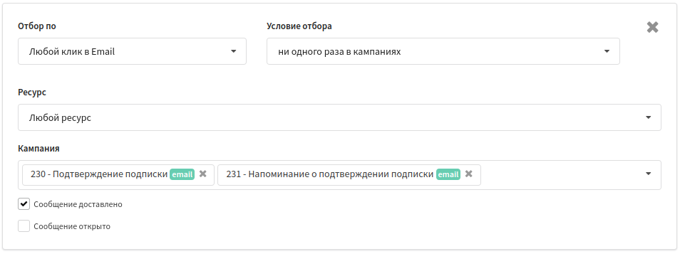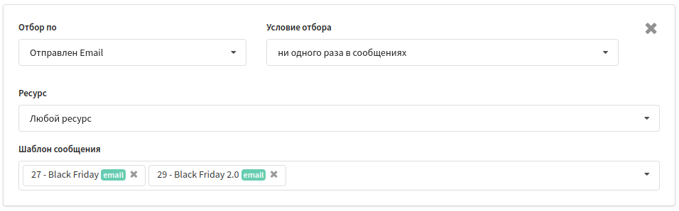 - Ни одного раза — выборка по отсутствию хотя бы одного действия выбранного типа. В зависимости от оператора можно дополнительно указать Рассылку, Сообщение, период времени или количество дней с текущей даты.