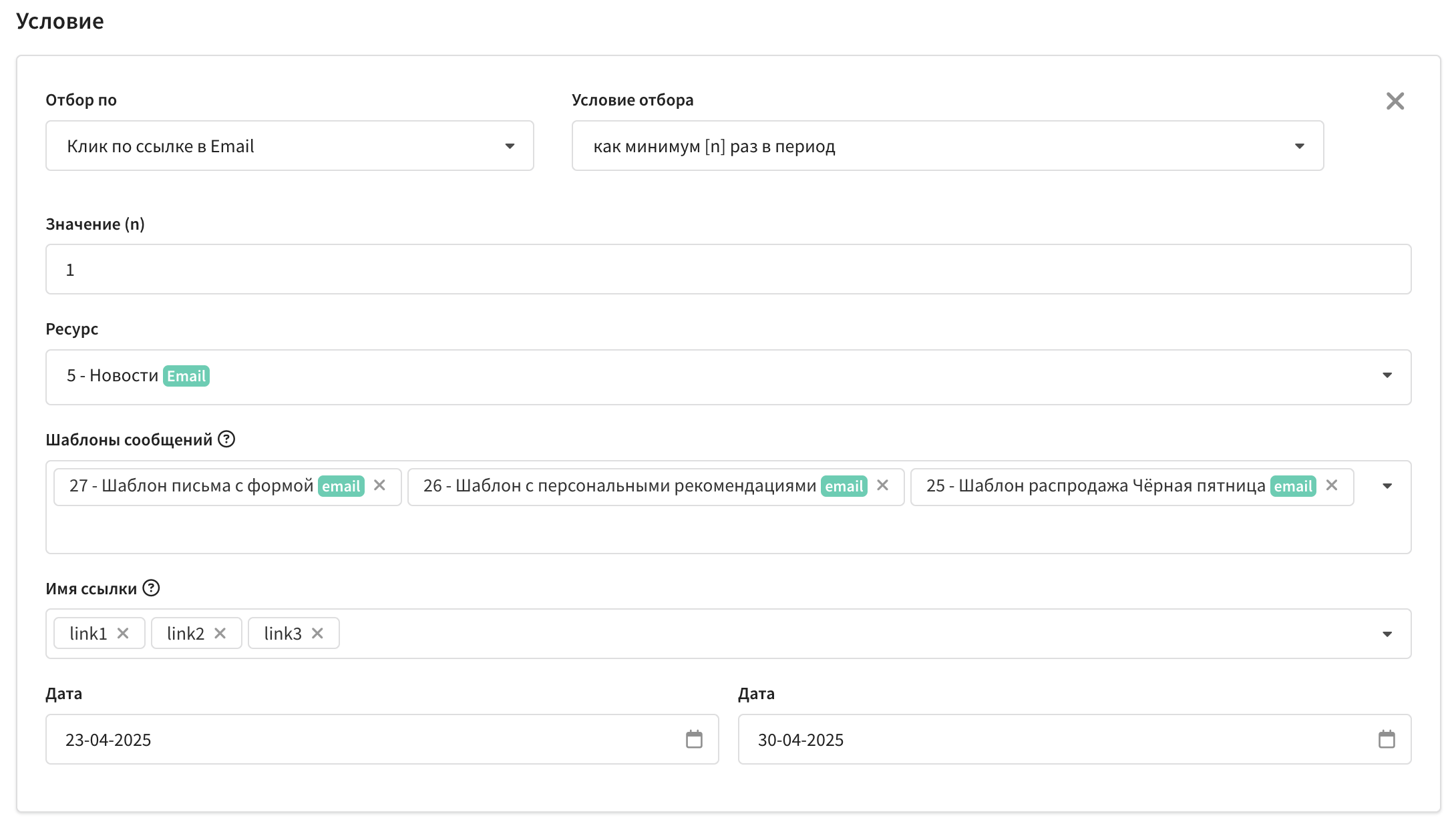 - Клик по ссылке в сообщении: Email, SMS, Push, Viber, WhatsApp, Telegram Bot, VK Notify. Позволяет указать конкретные шаблоны и ссылки для выборки переходов.