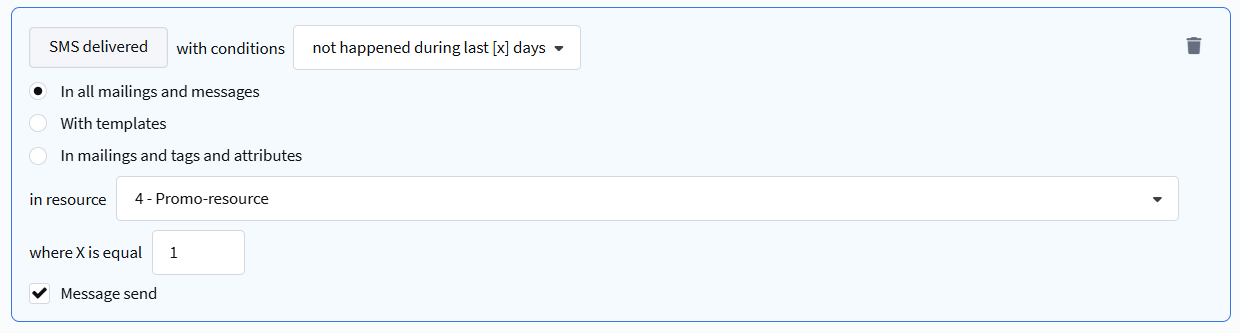 - Not happened to a messages / mailings — the profile will be included in the segment if the action did not occur in each of the selected objects.