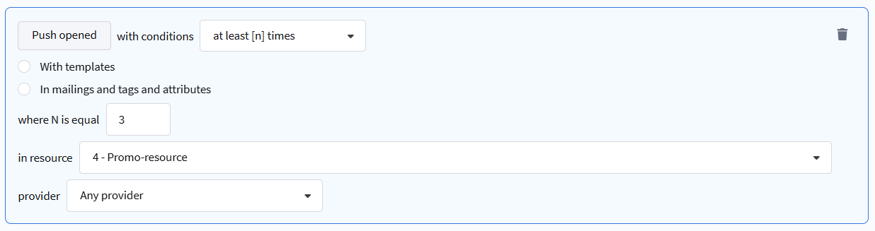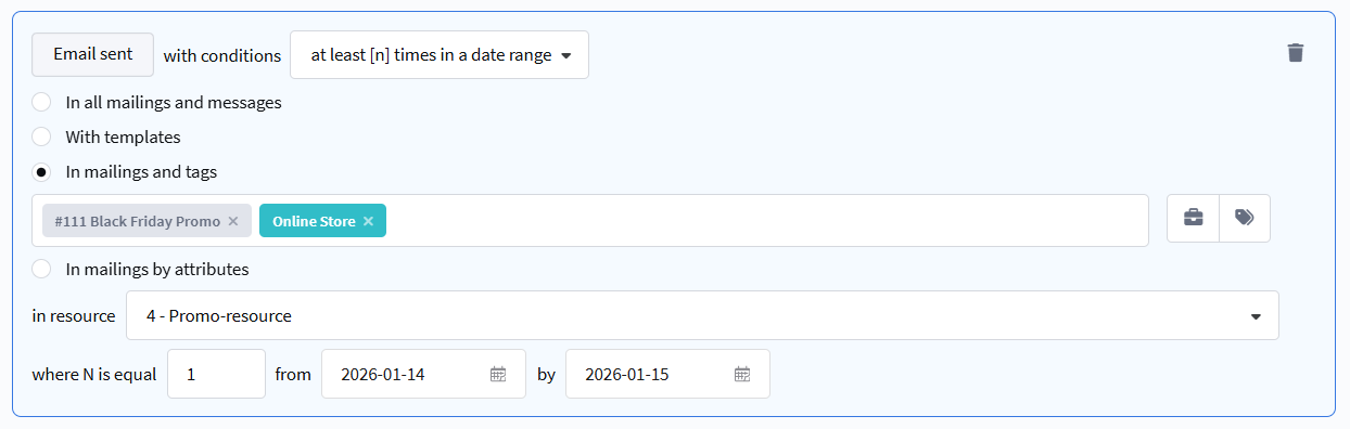 - At least [n] times in messages / in mailings — the profile will be included in the segment if the action occurred in any of the selected templates or mailings.