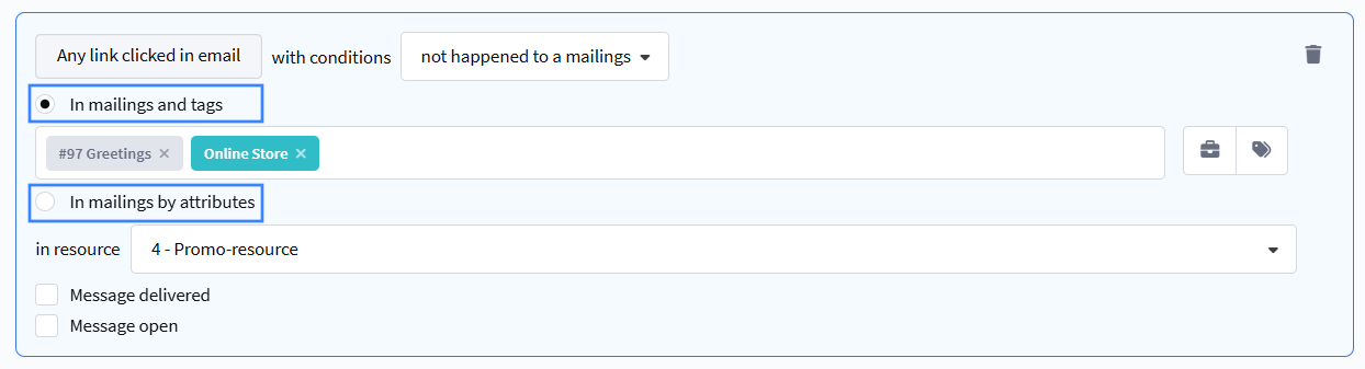 - Any click in message: Email, SMS, Push, VK Notify. Selects recipients who clicked on any link in the message.